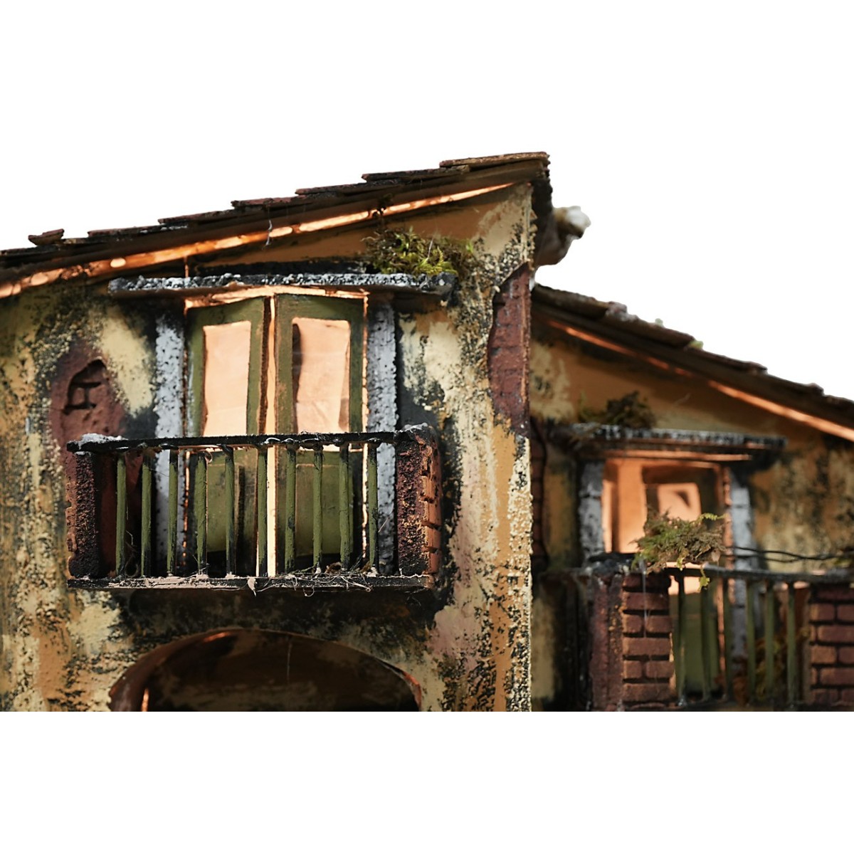 Neapolitan style illuminated nativity scene at the center features a large waterfall flanked by two large open buildings where you can place, for example, the Nativity in the arched one and create a pizzeria or bakery in the square one, as there is a double oven inside with flame effect light. At the two ends, there is a fountain and a staircase leading to the upper floor residences characterized by large terraces. The windows and small balconies arranged at different levels add dynamism to the structure already well-finished with stuccoed walls and many small details. The waterfall and fountain are complete with a pump, the fire is equipped with light, and they are powered by electricity. The nativity scene is recommended for statues with a height of 10-12cm and is handcrafted in Italy with wood, cork, and moss. It is specified that all information regarding the statues that can be paired is available in the product details.