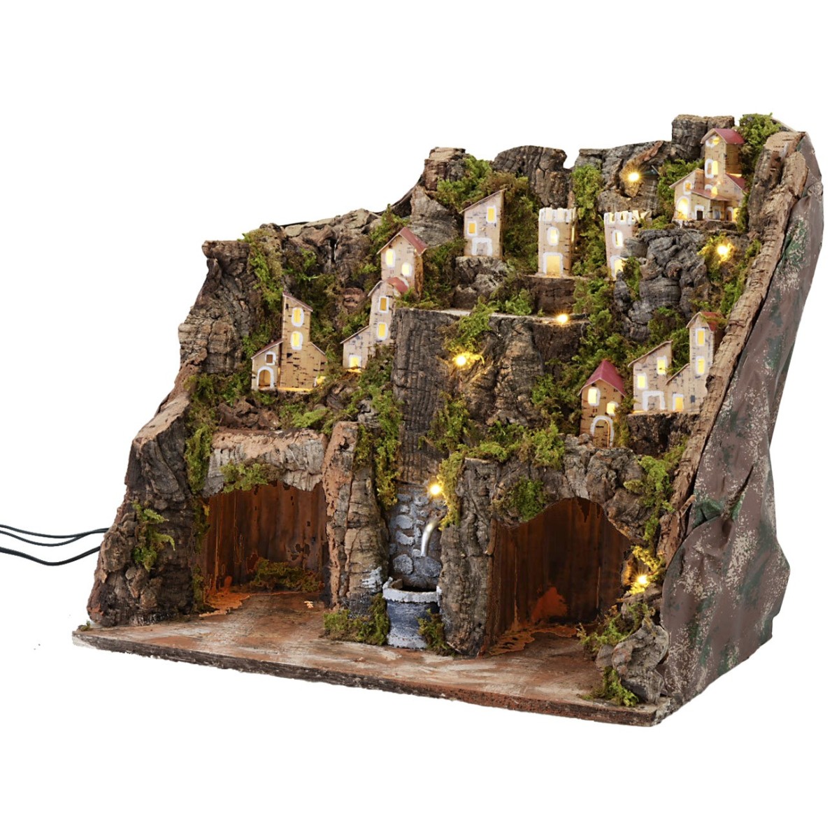 Handcrafted illuminated nativity scene powered by electricity complete with figurines, set against a mountainous background, with small illuminated houses distributed along the slopes, creating a rural village atmosphere. In the bottom left, we find a cave where it is recommended to add figurines of 8 cm height to enrich the environment. The scene is enhanced by warm lights that bring the entire village to life, illuminating the houses and the main cave. At the bottom center, we can find a fountain powered by electricity, with a tap coming out of the wall and pouring water into a small basin. This product was handcrafted in Italy with wood, cork, and moss.