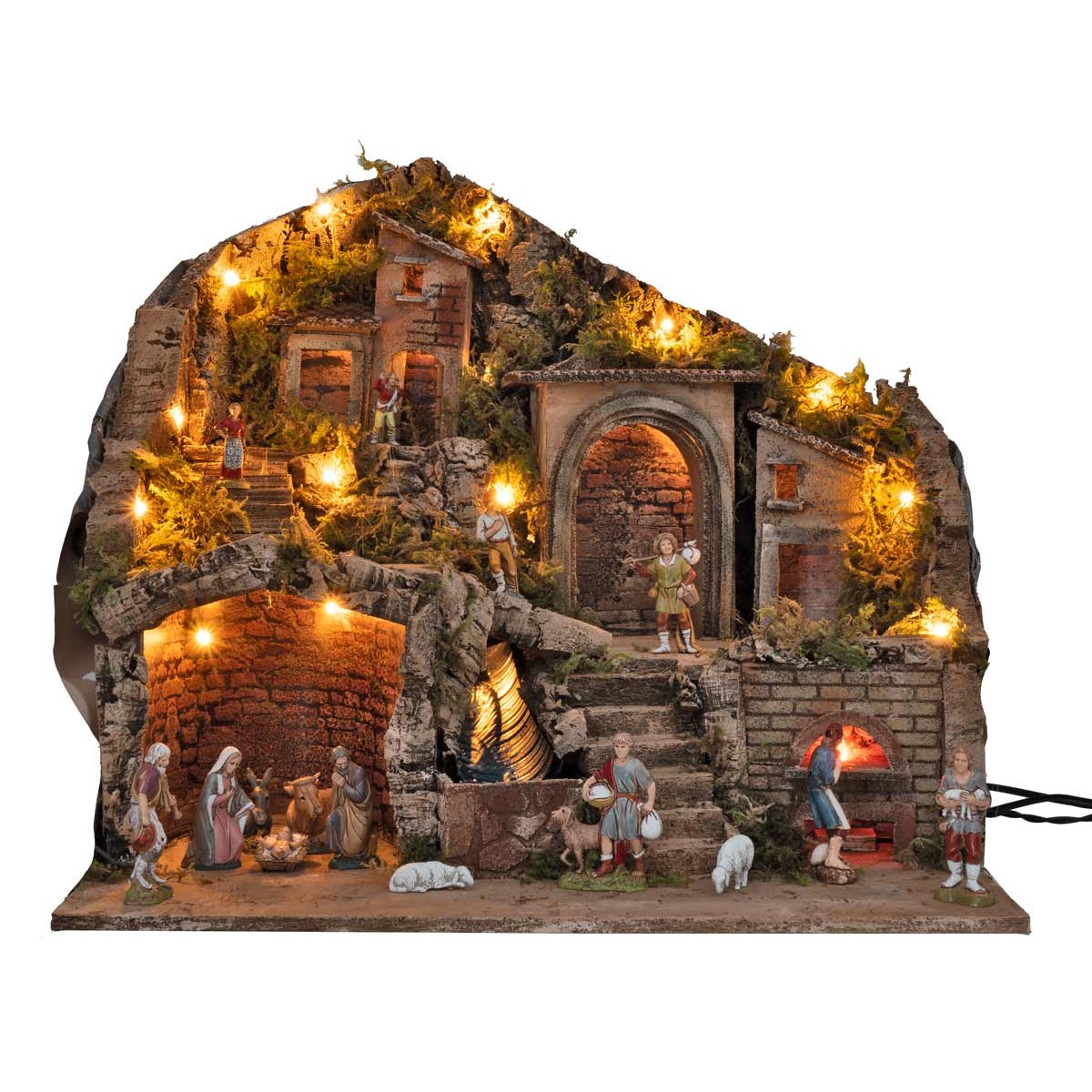 Handcrafted illuminated nativity scene with a functioning fountain and windmill, enriched with Landi Moranduzzo series 10 cm statues. The scenery, powered by electricity, is developed on two levels, each characterized by unique details.
