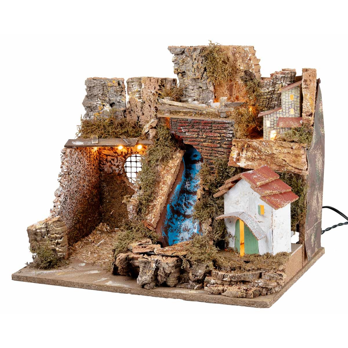 The set design develops on two levels. On the left, there is an open stable with a wooden roof and bark walls, internally illuminated by three lights and equipped with a round grate at the back; inside it is possible to set up the Nativity scene. In the center, there is a working waterfall, nestled among rocks and moss. On the right, there are two houses: below, a small house with a green arched door and a red-tiled roof; above, two stone houses with sloping roofs, integrated into the rocky backdrop.