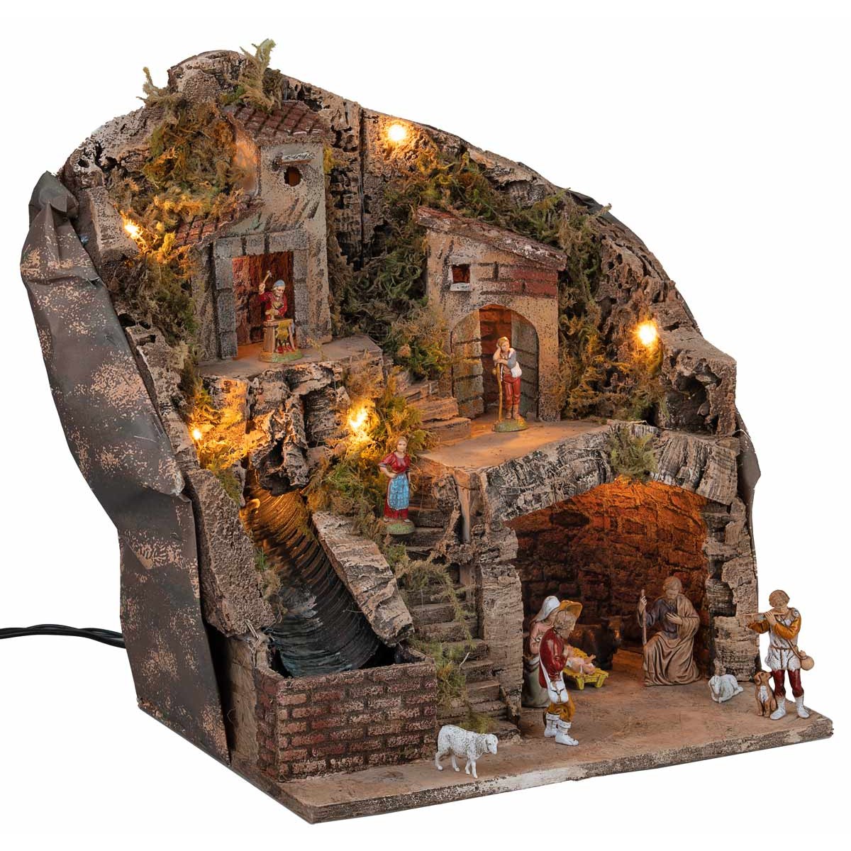 Illuminated handcrafted nativity scene with working waterfall, powered by electricity, complete with 8 cm Landi Moranduzzo series statues.