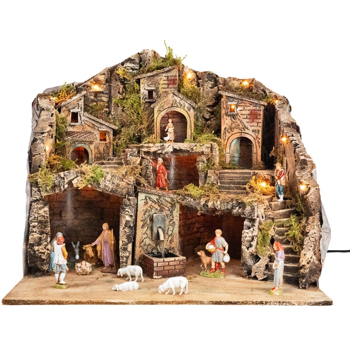 Artisanal illuminated nativity scene with fountain equipped with a pump for water recirculation operating on electricity, complete with Landi Moranduzzo series statues of 10 cm.
