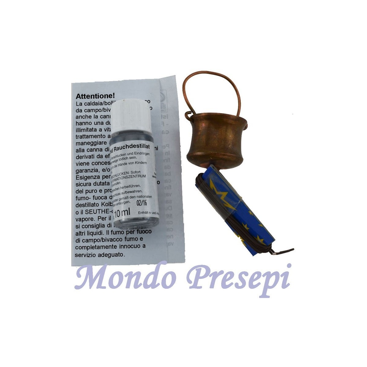 Il kit è composto da un flacone ml.10 di liquido fumogeno e da un pentolino in rame dal diametro di cm 2,6cm. Il tegame può esser collocato direttamente sui fuochi per fare l'effetto fumo che esce dalla pentola oppure inserito nei comignoli. Nel set è inclusa anche una spinetta necessaria per collegare il pentolino al portapile o all'alimentatore con multipresa. Se, invece, si volesse collegare il pentolino ad un normale alimentatore, si dovrà sostituire la spinetta con un morsetto e basterà collegare le due estremità dei cavi.