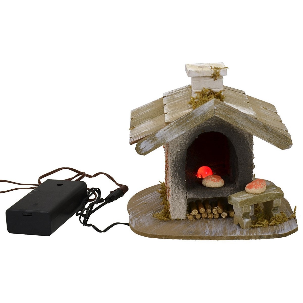 Forno per panettiere consigliato per statue di altezza 6-6,5 cm. L'articolo è ricco di dettagli: della legna accatastata sotto al camino e due pagnotte pronte ad essere infornate. Il forno si presenta molto caratteristico ed è dotato di luce rossa fissa completo di portabatterie (2xAA non incluse) con pulsante per accensione e spegnimento. Per quanto riguarda la luce rossa fissa, se si desidera rendere pulsante la luce è consigliato l'acquisto della multipresa che crea l'effetto fuoco inoltre se si desiderasse alimentare il fuoco con l'alimentatore con multipresa a 3,5 volt, entrambi i prodotti sono disponibile nei correlati situati sotto la tabella. Il prodotto è realizzato artigianalmente in Italia con legno, sughero, muschio.