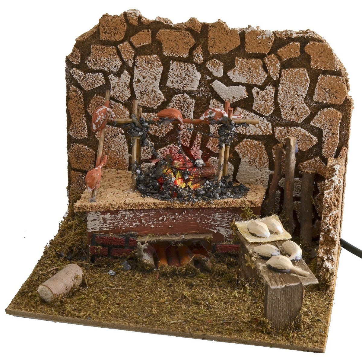 Setting with a large wooden rotisserie on which chicken is cooking. The embers are illuminated by a flame-effect lamp that works with electricity, on the left a rod with the ready-made skewer, while on the right and at the bottom some firewood. In the foreground there is a small table on which the next pieces to be cooked are placed. The scene is framed by a stone wall, is recommended for figurines of 10-12 cm in height and was made with wood and cork.