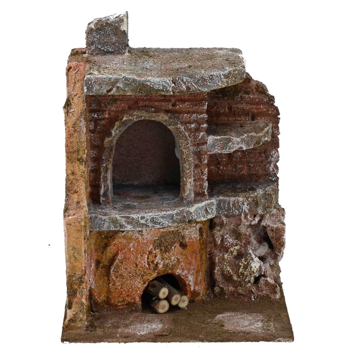 Forno per presepe stile classico Popolare realizzato artigianalmente in polistirene e legno, consigliato per statue di altezza 10 cm. La struttura del forno è angolare composta da più livelli, nella parte inferiore si trovano un piccolo deposito per la legna, il piano di lavoro è sovrastato dal forno dove è possibile collocare una piccola luce per simulare il fuoco che arde (nei prodotti correlati sono disponibili le luci indicate sia nella versione a batterie che corrente), la struttura termina con un tetto spiovente e camino.