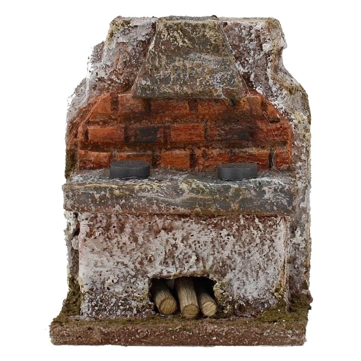 Cucina per presepe stile classico Popolare realizzato artigianalmente in polistirene e legno, consigliato per statue di altezza 6-6,5 cm. La struttura del forno è composta da due livelli, nella parte inferiore si trovano un piccolo deposito per la legna e in quella superiore il piano di lavoro con due fuochi e una cappa.