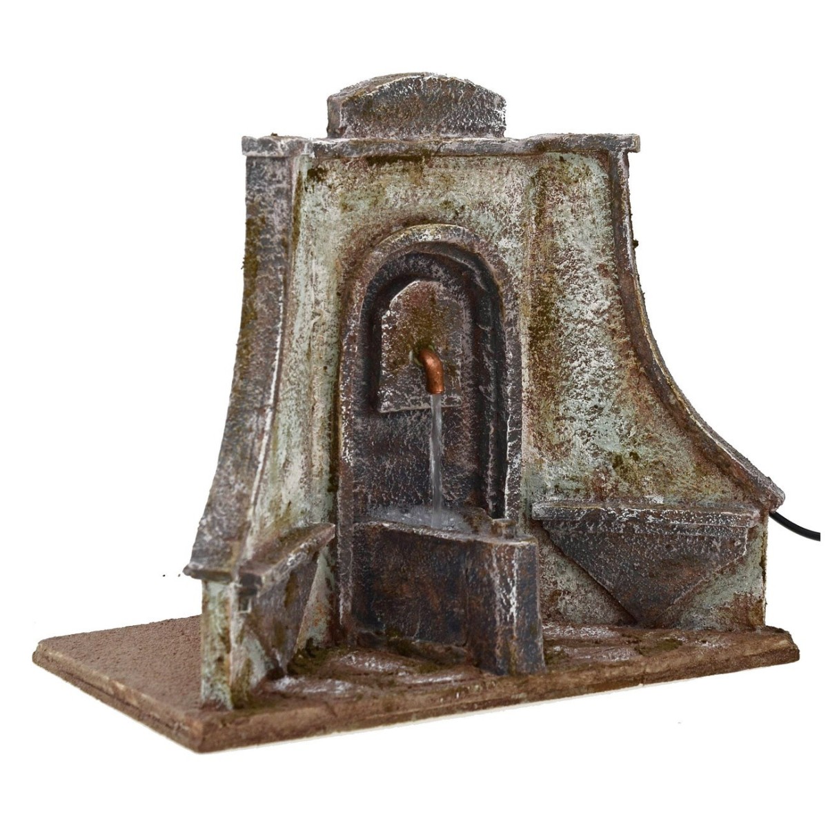 Fontana functioning with a wide decorative art facade with a special triangular shaped tub, on the sides two benches that recall the conformation of the ground structure of the fountain, while the vertical one is etched in an all-sixth arch made in the rock wall. Article produced in polystyrene, wood and copper from savory Italian artisan hands for the popular classical Presepe ; fountain suitable for statues of height 10-12 cm.