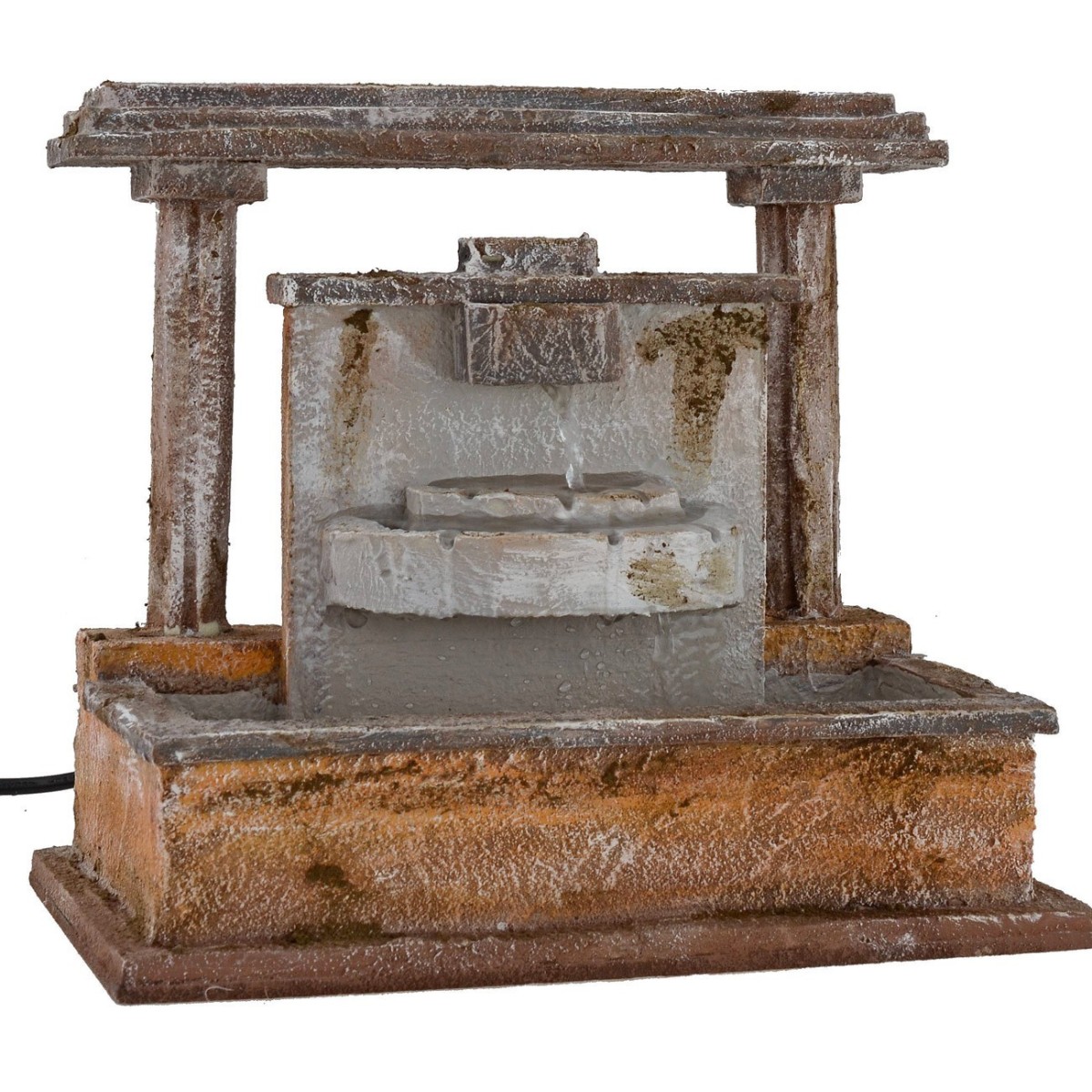 Fontana completa di pompa funzionante a corrente. La struttura presenta un elegante forma, che rende la fontana suggestiva. La vasca è rettangolare, e l'acqua sgorga dall'alto. Prima di immettersi nella vasca maggiore sottostante, l'acqua percorre due vaschette minori che si trovano sulla parete sovrastante. L'articolo è prodotto in polistirene e legno da sapienti mani artigiane italiane per il Presepe classico popolare ed è consigliato per statue di altezza 10-12 cm.