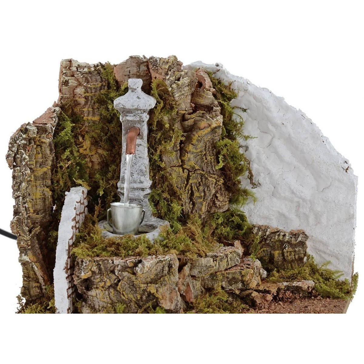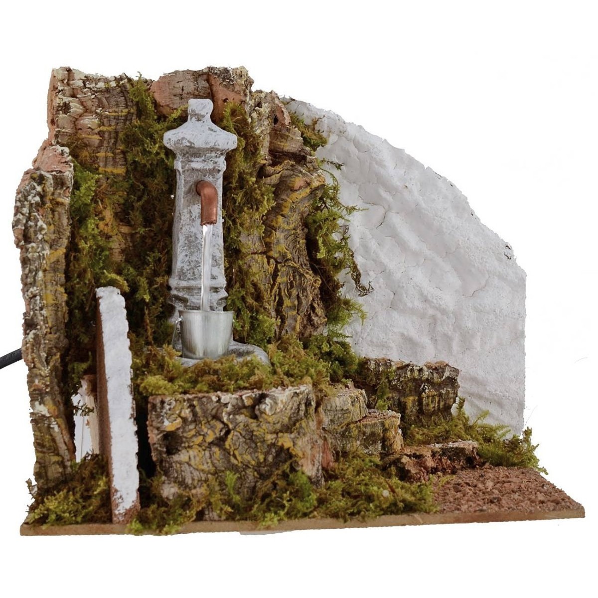 Fontana a full-current, running pump column. The structure is located on a small upscale, reachable thanks to a few natural climbs located on the right side. The water disgorges from above, thanks to the bustling copper beckons and throws down to the bottom, where a bucket is present. A characteristic element is the surrounding vegetation green. The article is produced in wood, cork and musk, materials thanks to which the landscape turns out to be very natural and evocative, and created by savvy Italian artisan hands for the popular classic Presepe. Recommended for statues of height 10-12 h cm.