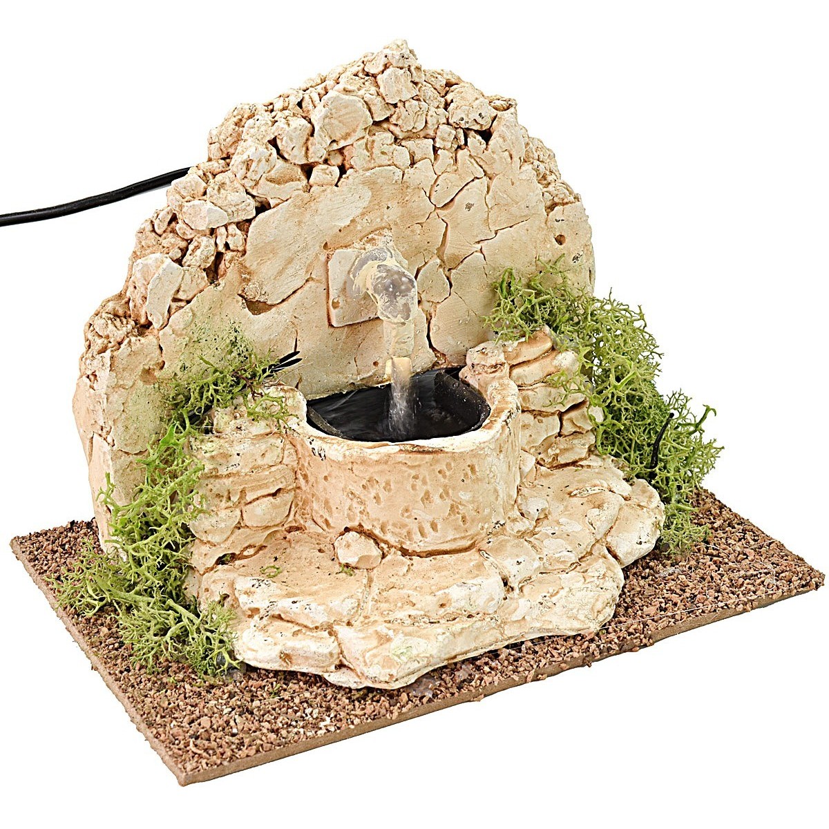 Fountain for nativity scene made from a light stone wall, from the tap flows the water moved by the pump running on current that falls into the basin below. The fountain is suitable for statues of 8 - 10 cm height, it is handcrafted in Italy with wood, cork and plaster.