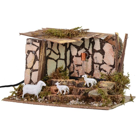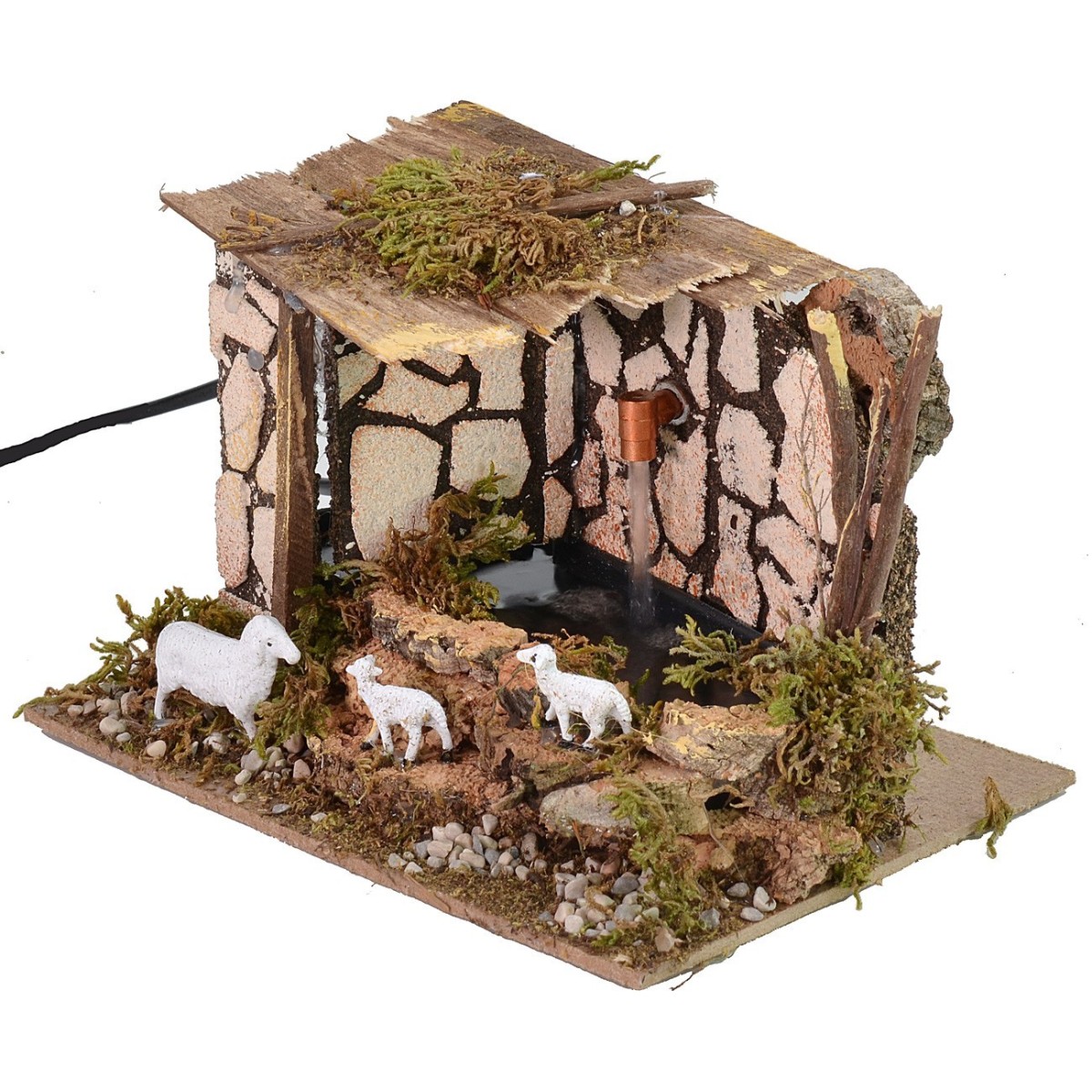 Drinking fountain among the rocks with steps in front of which there are sheep, a tap emerges from the stones from which running water flows and the movement is powered by electricity. This article is suitable for 8-10 cm statues , is well finished and can be enriched with other ANIMALS or SMALL PARTS available in the appropriate sections of our site.