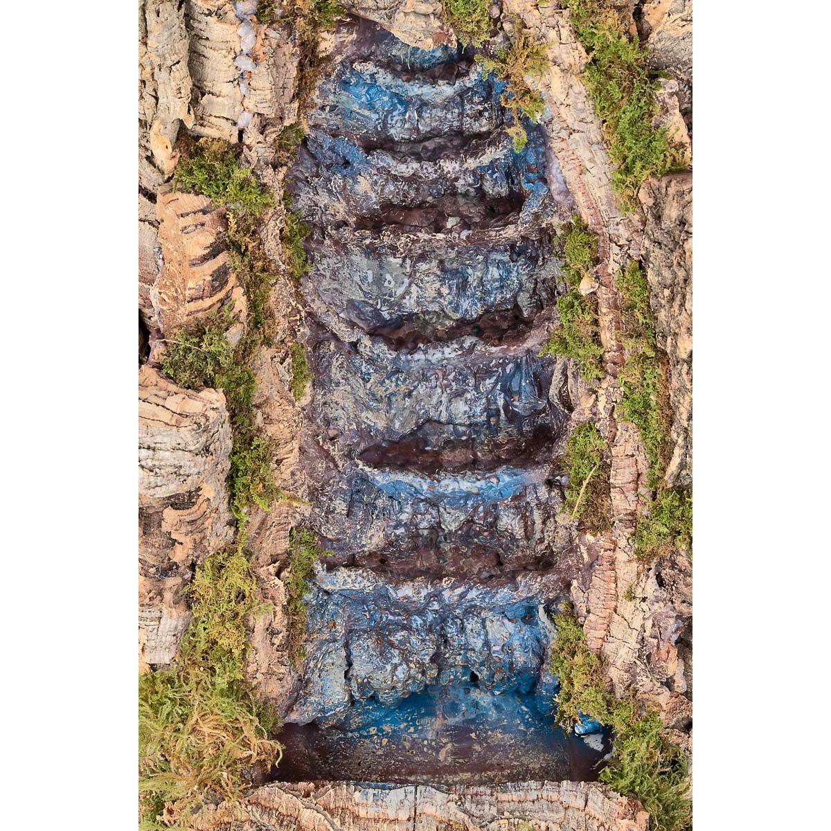 Stepped waterfall for nativity scene, complete with electric pump working on current. Handcrafted in Italy with wood, cork, and moss. Perfect for enriching your nativity scene with a natural and realistic touch. The stepped effect, created by polystyrene rocks, gives a realistic movement to the water path, accompanied by natural finishes with cork bark and moss for an authentic and evocative setting.