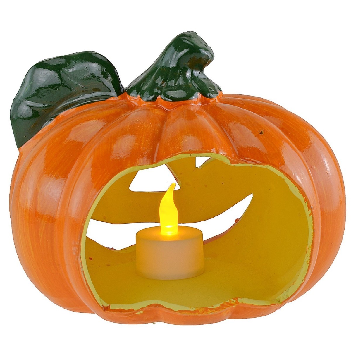 Pumpkin with leaf ceramic candle holder for Halloween with hole in the back. The item is sold without a candle, the illuminated image is for demonstration purposes only and the candle used is available on our online site.