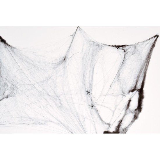 40 g pack. of white polyester that can be worked at will to create fake spider webs, to be used for Halloween scenography, complete with two PVC spiders. In the black and orange photographs it is visible how the processing of the spider web can develop.