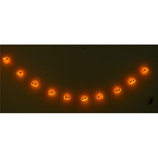 Catena di 10 zucche per Halloween a luce fissa funzionanti a batterie (non incluse), la distanza tra le zucche è di 16 cm per una lunghezza totale di 196 cm.