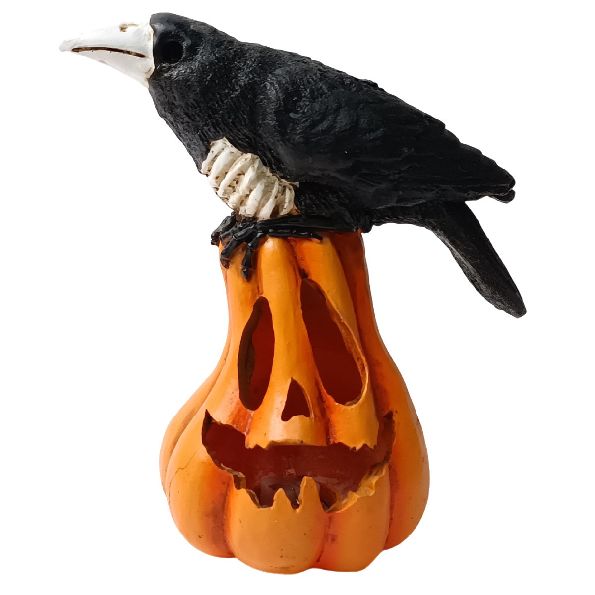 The carved pumpkin features an expressive face and is topped with a black crow, creating a scenic effect perfect for Halloween.