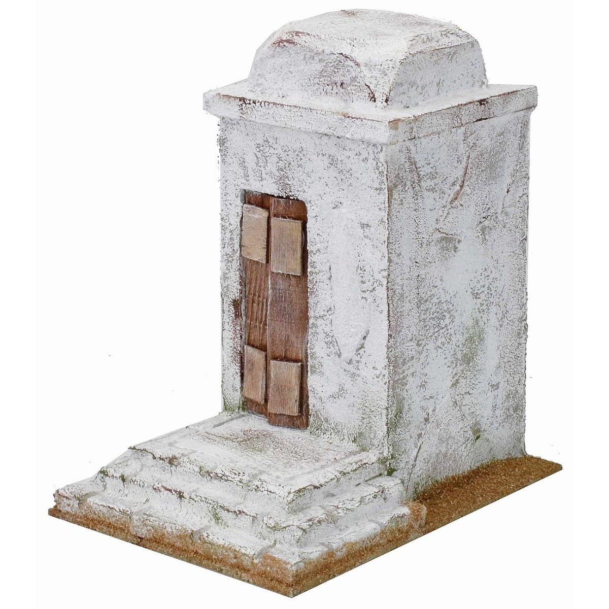 Casa palestinese singola con scalinata fronte alla porta semi aperta,sul lato destro una piccola finestra con ante socchiuse e sul tetto la caratteristica cupola. Questa ambientazione è stata creata da artigiani italiani per il Presepe palestinese in polistirene, consigliata per statue di altezza 8-10 cm .