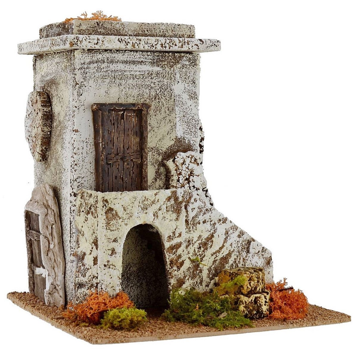Abitazione con bottega in stile classico dalle dimensioni:24x24x26,5 h cm. La casa si presenta ben rifinita nei dettagli: essa mostra, al piano terra, uno spazio con ingresso ad arco, coincidente con il sottoscala, dove sarà possibile allestire una bottega e, sulla sinistra, un ingresso con portone in legno. Proseguendo sulle scalinate, raggiungiamo la porta di ingresso dell'abitazione caratterizzata dal materiale del gesso con cui è realizzata. Di fronte alla porta vi è una base d'appoggio dove si potranno posizionare delle statue della serie Landi da 8 a 10 cm. Un altro elemento caratteristico è la vegetazione circostante, formata da muschio e lichene. La casa è realizzata in Italia da sapienti mani artigiane in polistirene, legno, sughero e gesso ed è adatta a statue Landi da 8-10 cm.