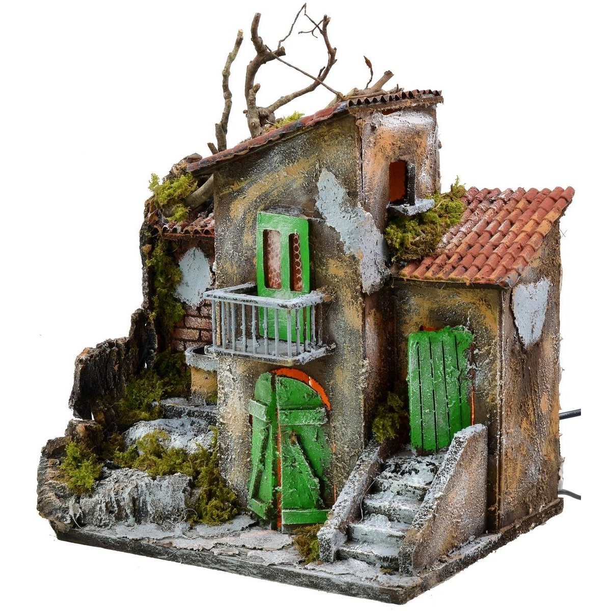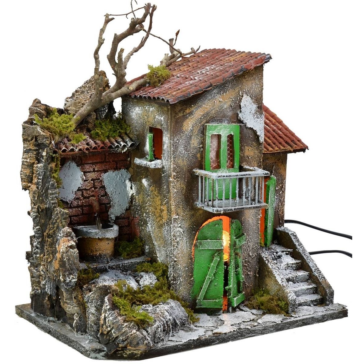 Handicraft house in the classic-Neapolitan style for Nativity scene, characterized by the warm white current lighting that makes the product very suggestive and by the fountain that always works by current, complete with continuous water recycling pump. The scenography is well finished in detail: on the lower floor there is a double-leaf entrance door in front of which it is possible to place statues with a recommended height of 10 h cm. On the left, there are perched stairs leading to the fountain; while on the right, there is a staircase that leads to another house. Near both stairways and on the balcony of the central house it is advisable to place statues 8 h cm high, thus obtaining a wonderful perspective effect. We also remind you that the 10 cm Landi Moranduzzo series has a real height of about 9 cm; while the 8 cm series has a real height of about 7 cm. Furthermore, the use of moss and twigs makes the landscape very realistic, as it is dense with vegetation. Item made and hand painted entirely in Italy by skilled artisan hands, using cork, wood and moss.