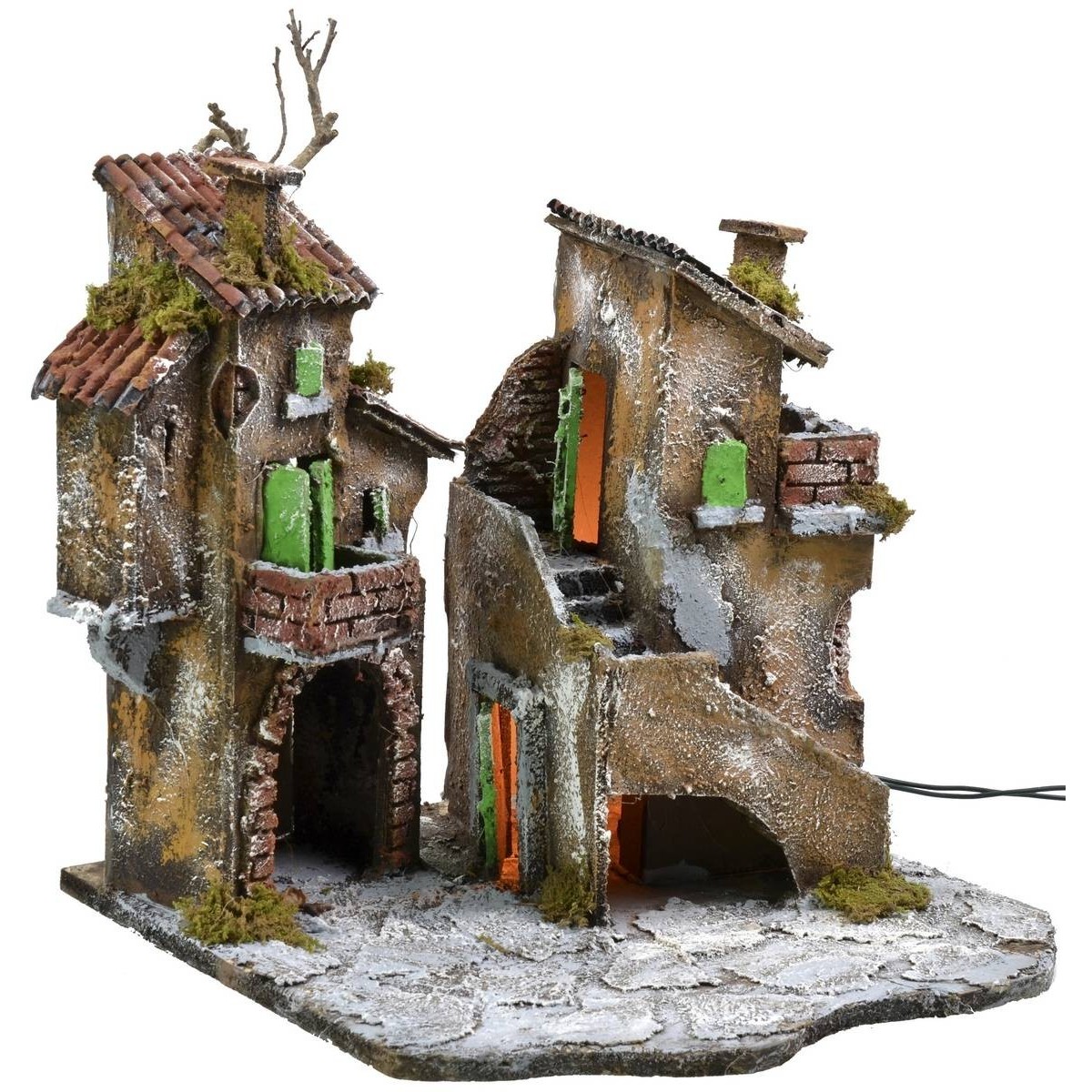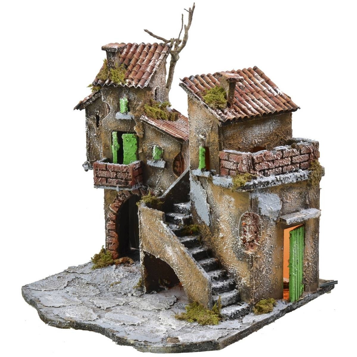 Courtyard with handcrafted houses in the classic-Neapolitan style for Presepe, characterized by the warm white current lighting that illuminates one of the two houses, making it very suggestive. The scenography is well finished in detail: on the lower floor there is a large courtyard where the two houses also extend. The first, located on the left, has a large space outlined by an arch where you can set up a shop. The second, reachable via a long L-shaped staircase, instead has a basement, ideal to be filled with small parts. In the whole lower area, it will be possible to place statues 10 h cm high, while above, on the stairs and on the balconies, it is advisable to place 8 h cm high statues, thus playing with perspective. We also remind you that the 10 cm Landi Moranduzzo series has a real height of about 9 cm; while the 8 cm series has a real height of about 7 cm. In addition, the use of moss and twigs makes the landscape very realistic, as there is vegetation. Product made entirely by skilled artisan hands. Item made and hand painted entirely in Italy by skilled artisan hands, using cork, wood and moss.