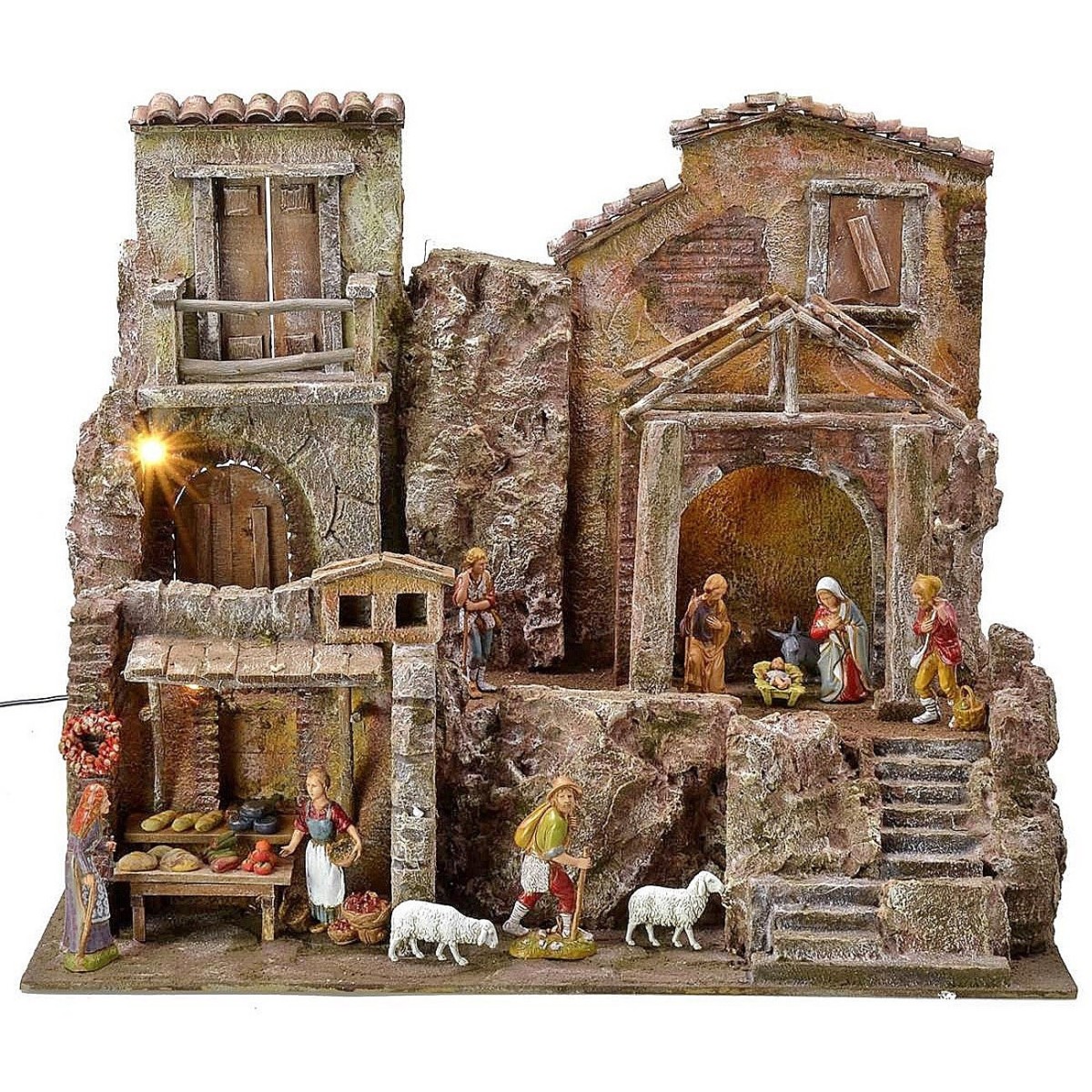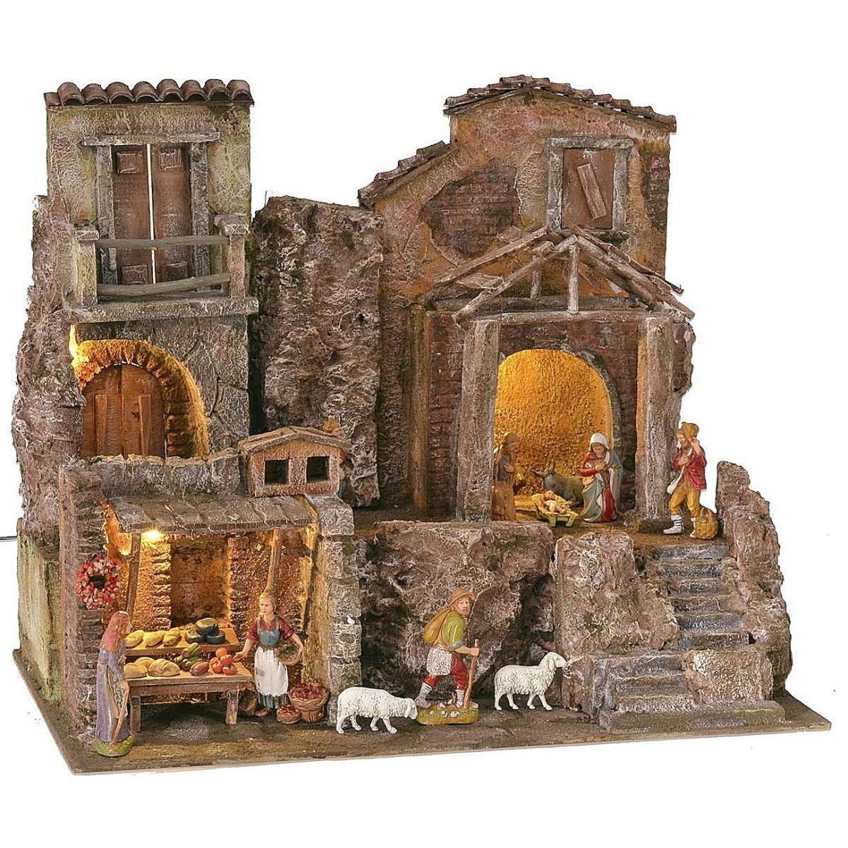 Village for handcrafted nativity scene in the classic-Neapolitan style with two house facades and two shops. The scenography is well finished in detail: on the left, on the lower floor, there is a greengrocer's shop, characterized by many small parts and a dovecote on the roof, while on the right there are stairs leading to the upper floor. Here we find two facades of houses, one with a balcony and the other with a shop to be set up from the ruined portico and arched entrance where the Nativity was placed. Both structures are finished with terracotta tiles. The warm, current-operated LED lights that illuminate the village give a suggestive atmosphere. On the lower floor, in the vicinity of the healthy workshop, statues of 10-12 cm height are placed, while on the upper floor, statues of 10 cm, thus playing with perspective. Item entirely made in Italy by skilled artisan hands, using polystyrene, cork and wood.