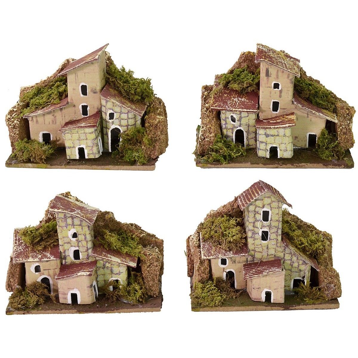 Set of 4 groups of houses ideal for scripts in the distance; the groups have four houses of different heights with respective entrances embraced by a hill. The article is produced in Italy by skilled artisan hands in cork and moss wood.