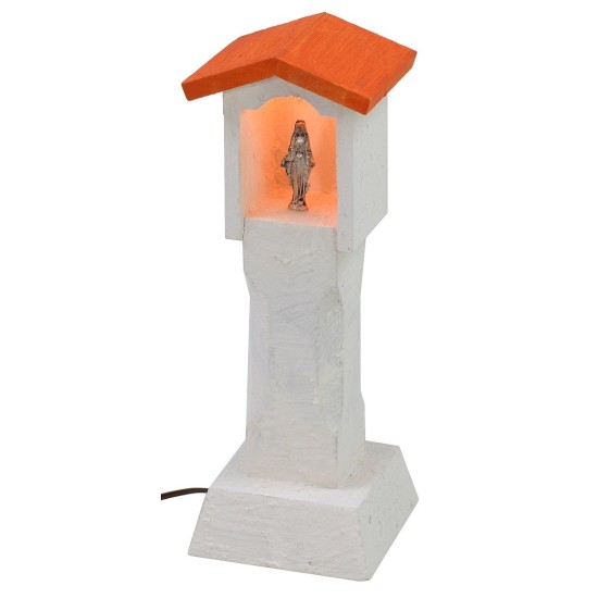 Santella con Madonnina illuminata a bassa tensione 3,5V. per il funzionamento della luce e necessario abbinare un trasformatore o un portapile disponibili nei prodotti correlati sotto la tabella. Consigliata per statue di altezza 8-10 cm.