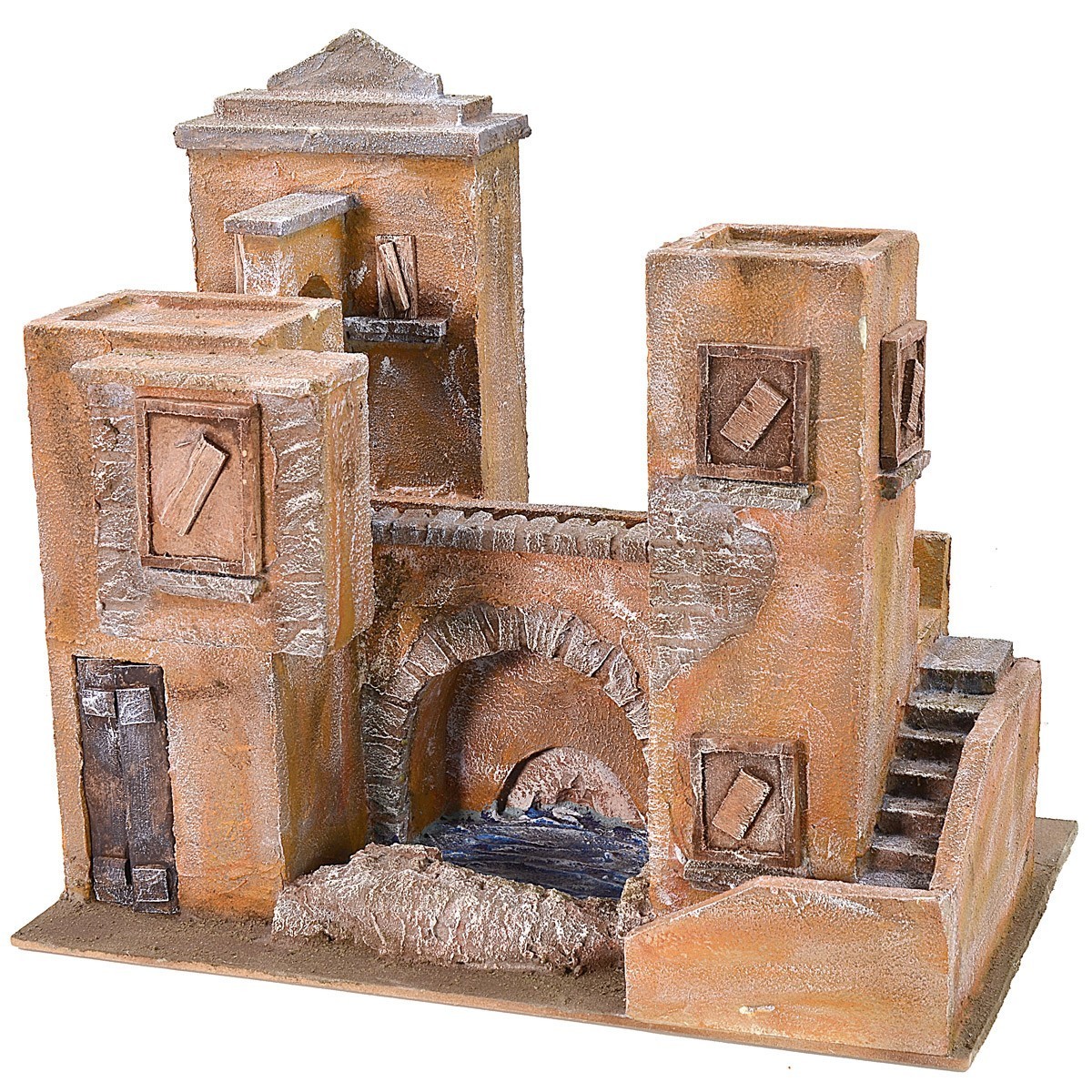 Palazzo per Presepe artigianale dallo stile classico-napoletano diviso da un laghetto. La scenografia si presenta ben rifinita nei dettagli: sulla sinistra è presente una scalinata ad angolo che permette di raggiungere un ponte che percorre tutta la lunghezza dell'edificio. Al centro del palazzo si trova un piccolo specchio d'acqua, perimetrato da delle rocce e sovrastato da un arco sopra il quale troviamo il ponte. Sarà possibile posizionare statue di altezza consigliata 10 cm; articolo realizzato interamente in Italia da sapienti mani artigiane, utilizzando il polistirene, il sughero e il legno.