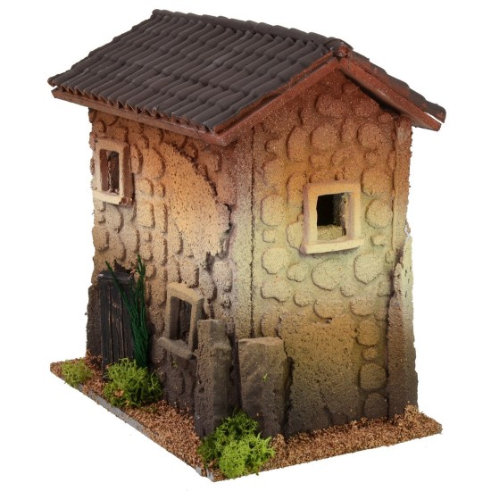 Casa disposta su due piani ben rifinita nei dettagli con pareti in sughero effetto pietra con sfumature molto graziose, sulla facciata un portone in legno e due finestre quadrate, il tetto spiovente e qualche ciuffetto di vegetazione verde. Si precisa che la casa è già provvista di foro sul lato retrostante e per renderla ancora più suggestiva sarebbe possibile inserire una luce che troverete nei prodotti correlati. All'articolo si possono abbinare statue di altezza 5,5-6 cm, è stato prodotto in Italia da sapienti mani artigiane utilizzando legno, sughero e muschio.
