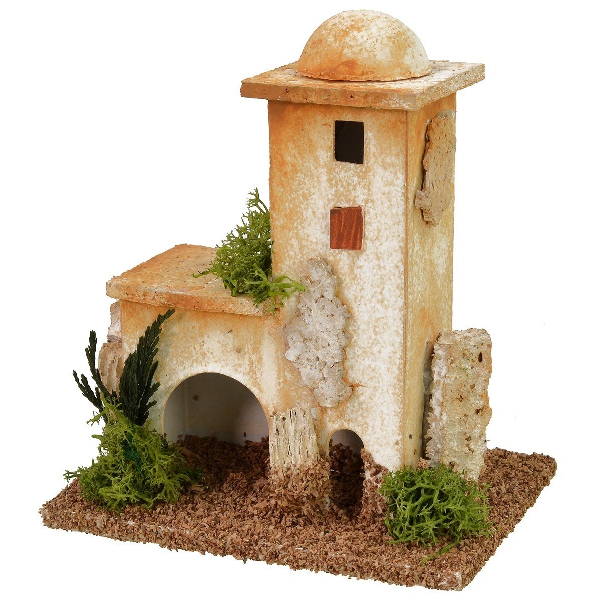 Coppia di minareti uno caratterizzato da un bastione con arco laterale, mentre l'altro ha il tipico tetto quadrato con cupola. Questo prodotto è stato realizzato da sapienti artigiani italiani per il Presepe in stile arabo; la struttura è adatta a statue di dimensione 3-3,5 cm.