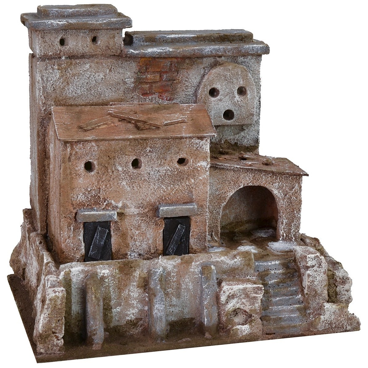 Farmhouse that stands on a raised plateau which is accessed via the staircase to the right, there is a stable opened by a large arch and next to it the multi-storey house characterized by small circular windows. The product was made in Italy by skilled craftsmen with wood and polystyrene. Given the size, it is recommended to use it from a distance to emphasize the perspective effect in the crib.