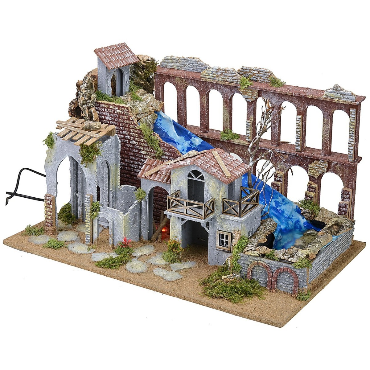 Two-level Roman aqueduct characterized by the typical arched openings, this water infrastructure was used to bring water from the sources at the top to the villages downstream, therefore there is a drainage waterfall that leads the water to the village below. A fire is located in the multi-story block; while on the left there is a structure with a large arch where, for example, the Nativity can be placed. The waterfall is complete with a pump and, like the fire, it runs on electricity. This item is recommended for 6 cm tall figurines and was made with wood, cork and moss.