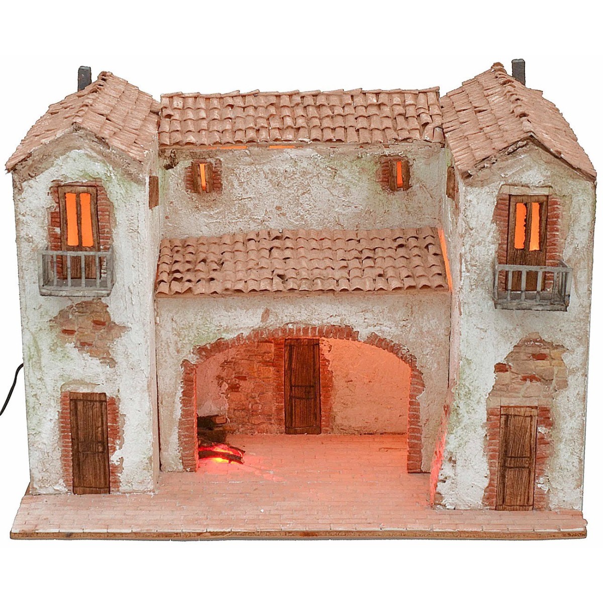Village composed of two residential units with a large central arched portico where it is possible to place the Nativity. In the central unit there is wood with a working fire. The peculiarity of this house are the walls with white stucco from which bricks can be glimpsed and other pieces from the series are available in the related products to complete the village in the nativity scene. The product was made in Italy entirely by hand with polystyrene, stucco and wood and is recommended for figurines with a height of 6 to 8 cm.