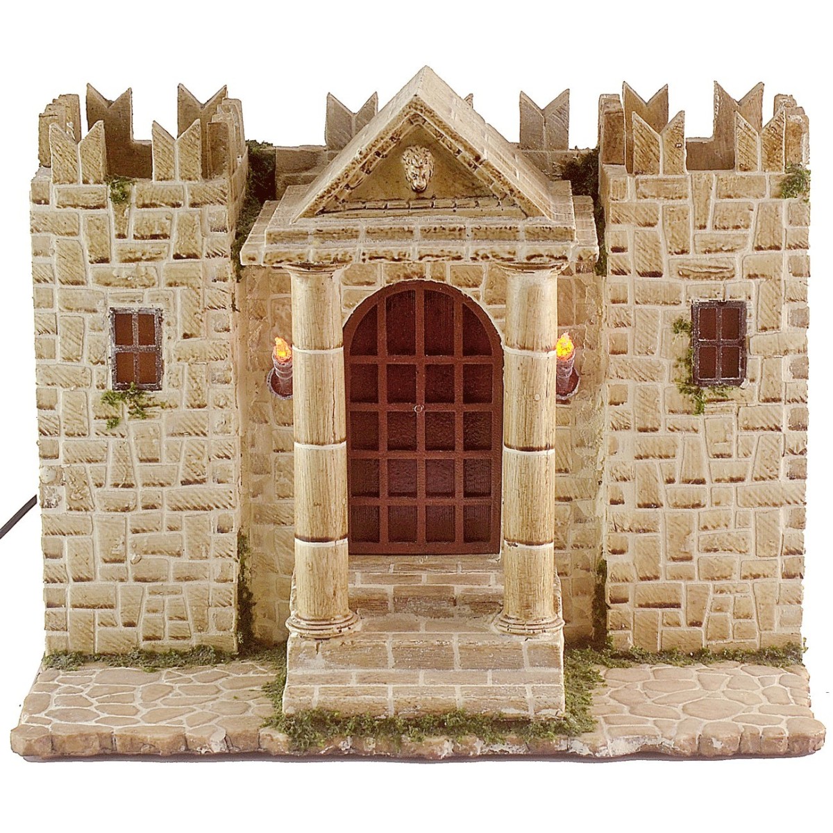 Fortezza ghibellina con due torri illuminate internamente da luce a led di colore bianco caldo e una loggia centrale con colonne e torce funzionanti con led tremolante. L'articolo e dotato di alimentatore, e funzionante a corrente. Il castello è stato prodotto artigianalmente in Italia, interamente a mano con resina. Si consiglia l'utilizzo di statue della serie 10 cm Landi Moranduzzo e se si desidera mettere delle guardie sulla torre è consigliata un0altezza di 7/8 cm, nella foto dimostrativa abbiamo utilizzato la serie Landi 8cm. Si precisa che l' immagine con le figure ha valore puramente dimostrativo e le statuine non sono comprese, ma possono essere acquistate separatamente nei prodotti correlati, sotto la tabella.