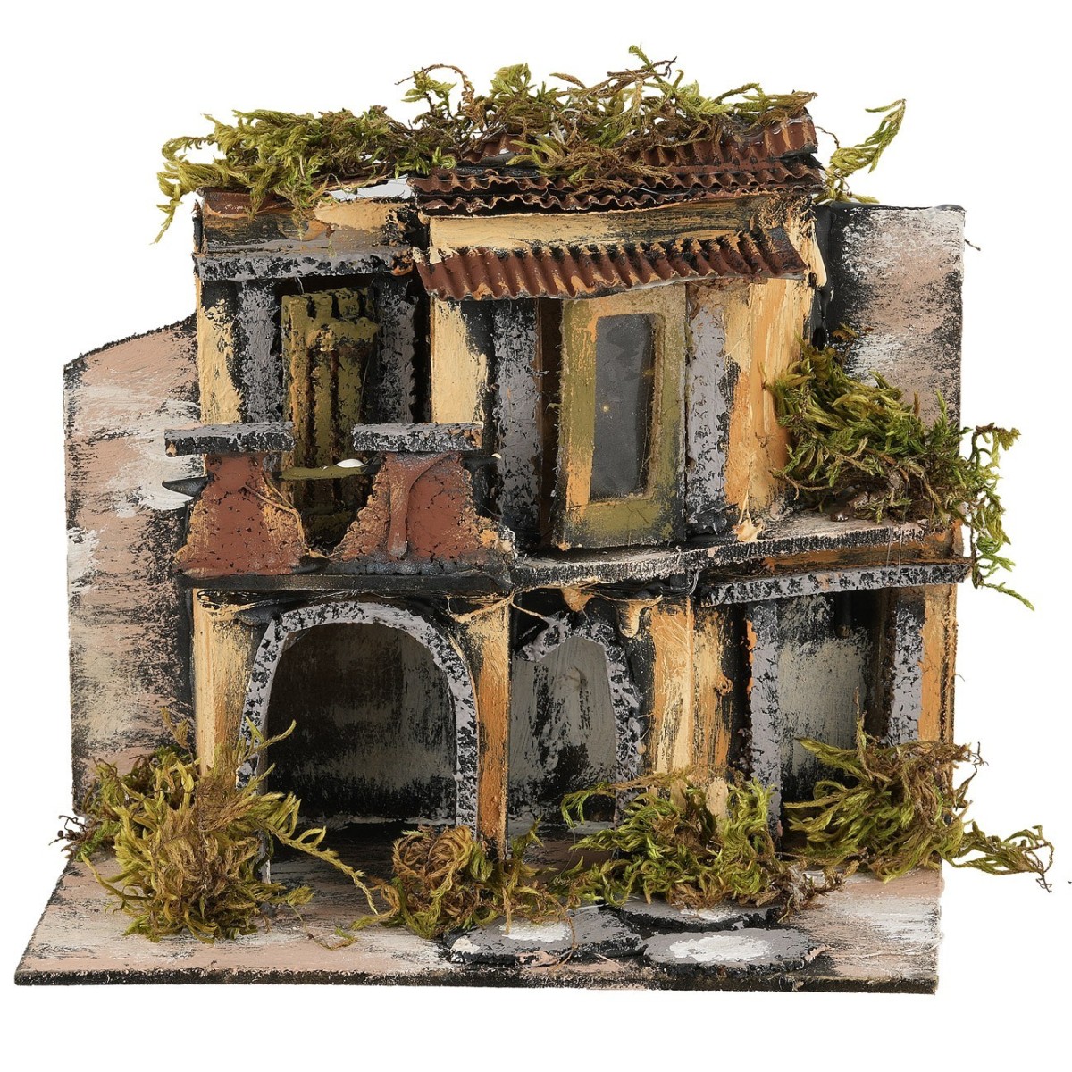 Illuminated houses with a double floor in Neapolitan style. On the lower floor, there are three doors for entry; while on the upper floor, there is a small balcony on the left and a half-open window on the right. Thanks to a small switch on the back, the upper floor is illuminated. The CR2032 X 2 batteries are already included. The product was made by Italian artisans using wood, cork, and polystyrene. It is also recommended to use with statues of height 6-7 cm.