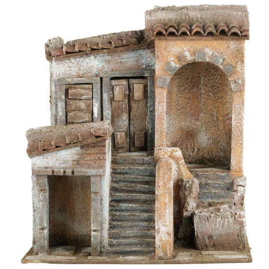 Gruppo di case, in un unico blocco, ideale per creare la città del presepe fai da te. La scenografia rappresenta due piani: al piano inferiore un vano da allestire come bottega. Al piano superiore sulla sinistra, grazie alle scalinate si trova una casa con porte e finestre; sulla destra una grande arcata che può essere allestita. Si consiglia l'utilizzo con statue di altezza 8-10 cm, e si precisa, che la figura non è inclusa, ma è disponibile nei prodotti correlati. Il prodotto è interamente realizzato artigianalmente in Italia con legno e polistirene, di conseguenza può mostrare leggere differenze dalle fotografie.