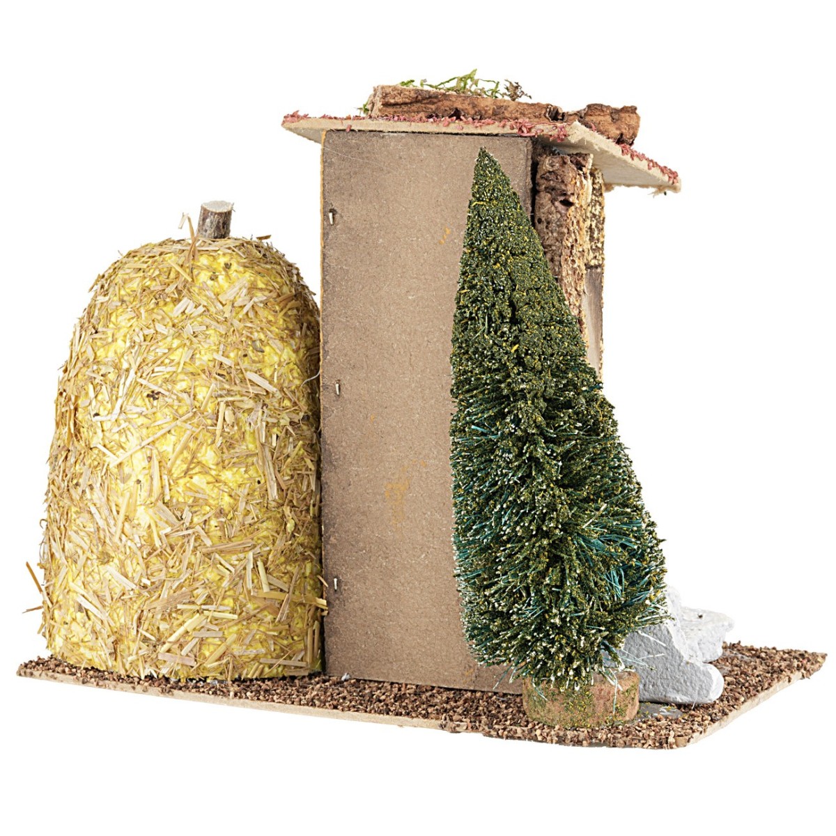 Rudimentary country house with a stone staircase that adorns the entrance of the house. The environment is decorated with a pine tree and a barn. The item is handmade in Italy using cork wood and moss.