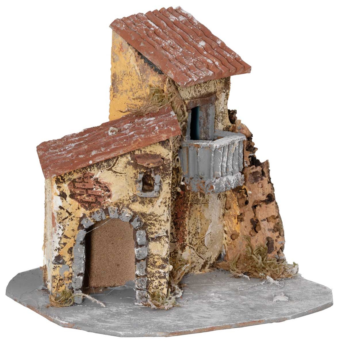 Rustic style nativity scene house. The structure features a tiled roof, a balcony, and an arched portal.