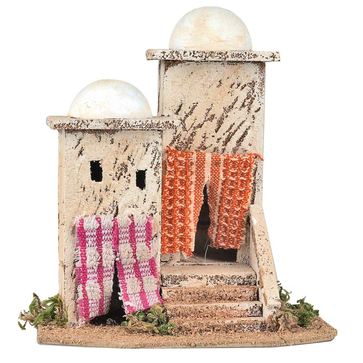 The structure represents two houses in Arab style, side by side, both with a white dome on the roof. In front of the entrances, there are colorful fabric curtains and a central staircase that connects the two levels.