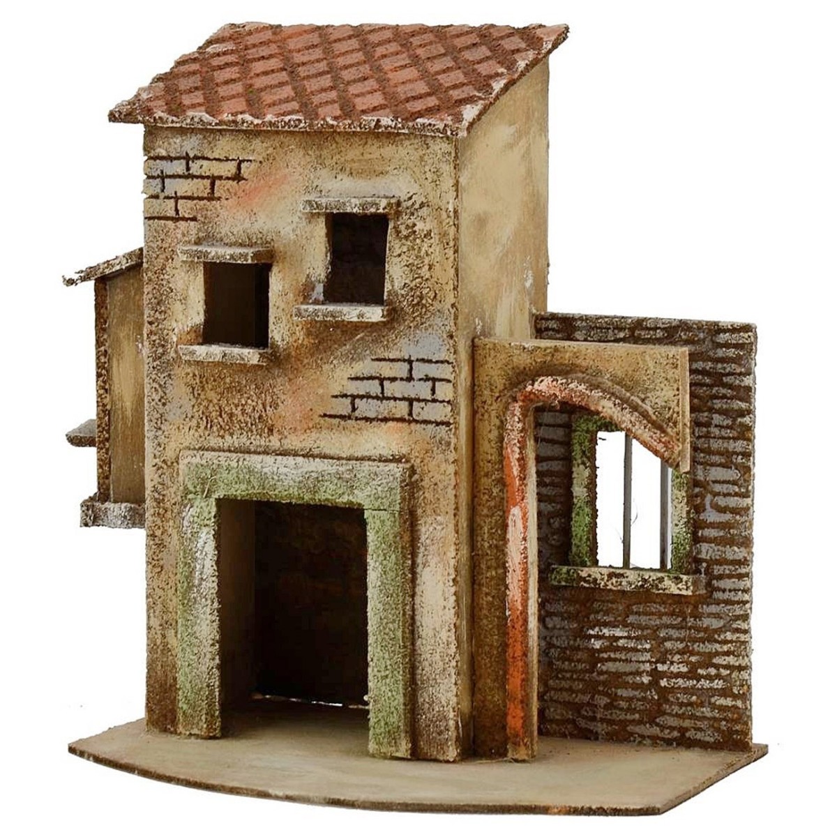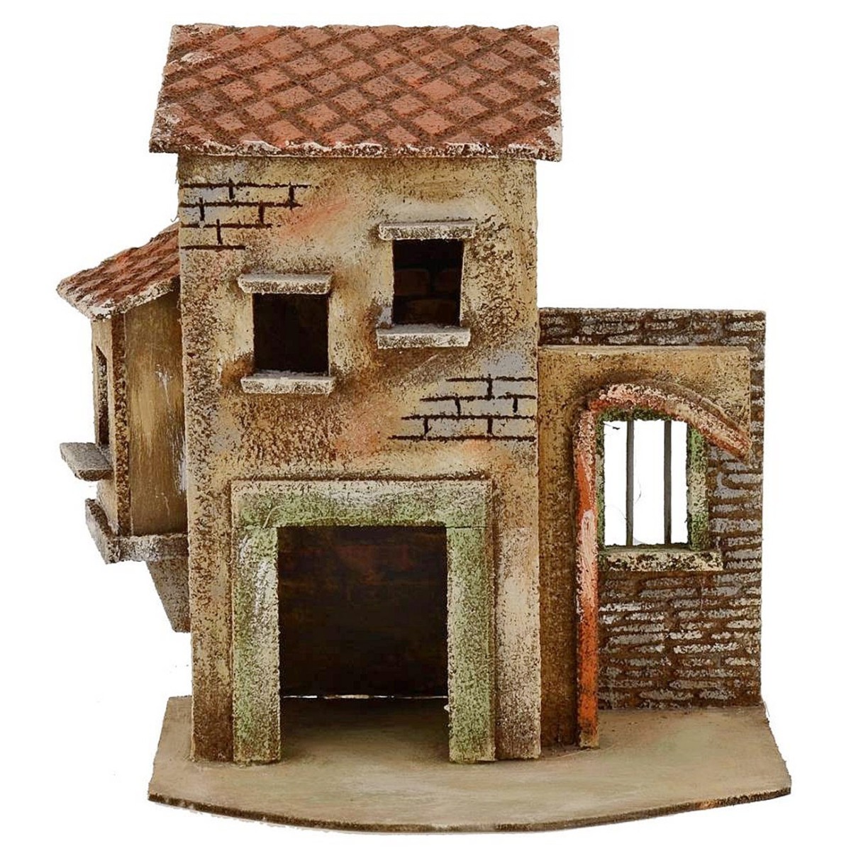 Casa su due piani con ampio portone d'ingresso aperto dove poter allestire una bottega, il primo piano è caratterizzato da due finestrelle e termina con tetto spivente. Sul lato destro troviamo un semiarco seguito da parete a mattoni a vista con al centro una finestra; sul lato sinistro si trova un terrazzo chiuso sempre a richiamare lo stile della casa. Articolo artigianale ben rifinito realizzato in legno e sughero, consigliato per statue di altezza 8-10 cm.