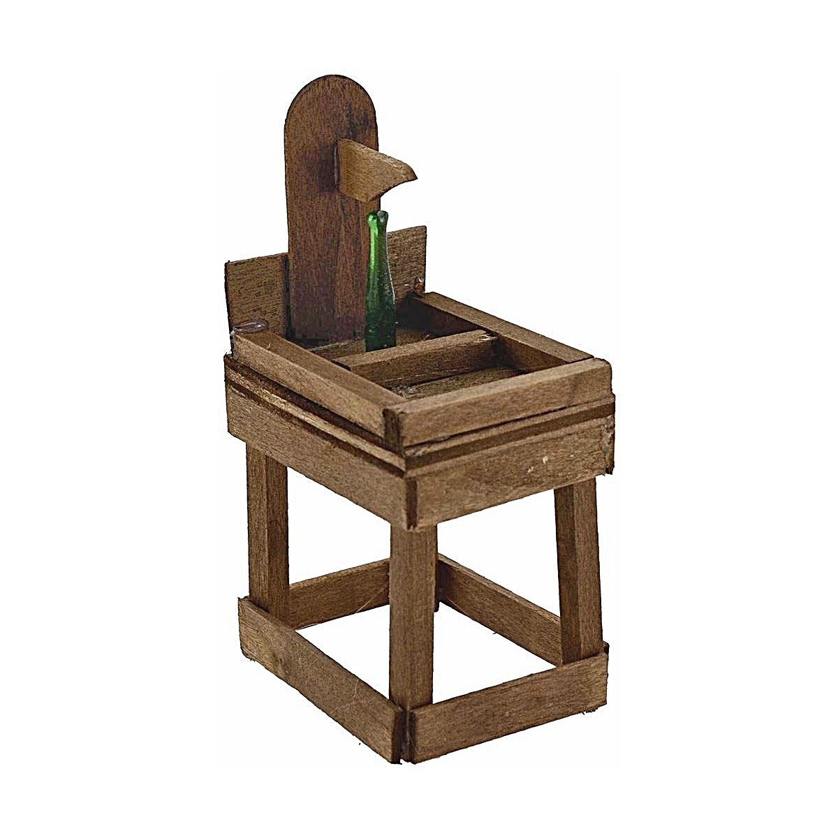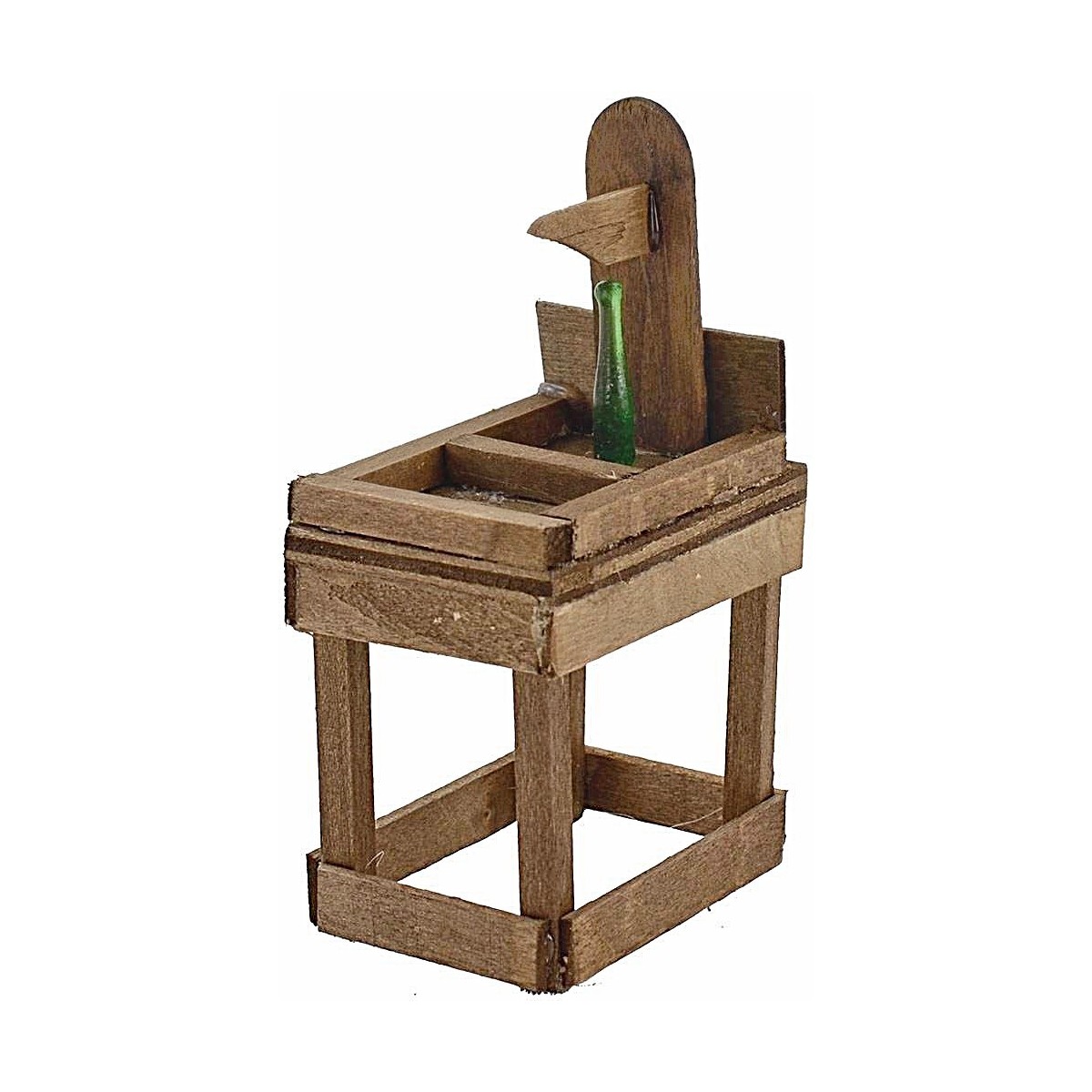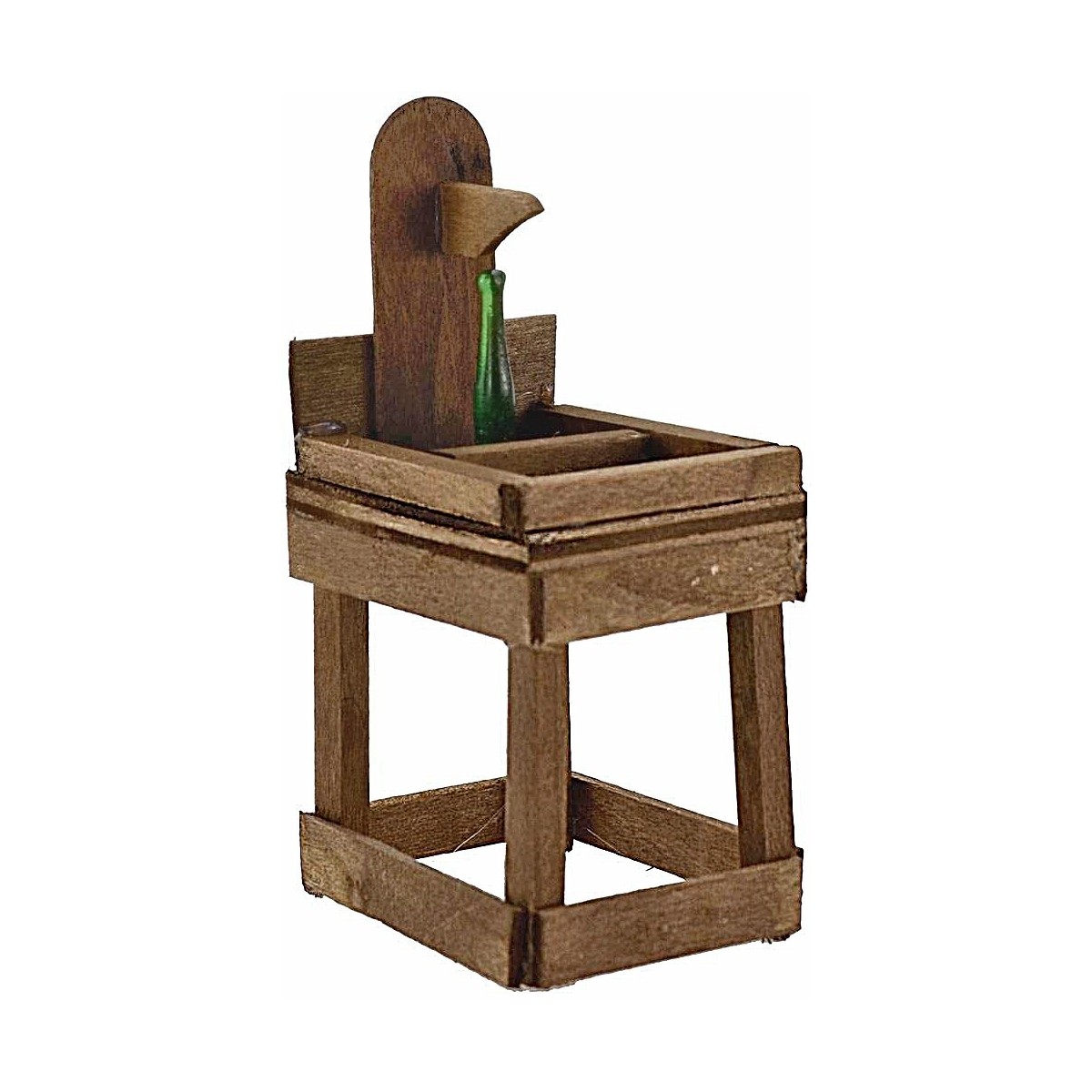 It is handcrafted with a natural wood structure and includes a miniature bottle.