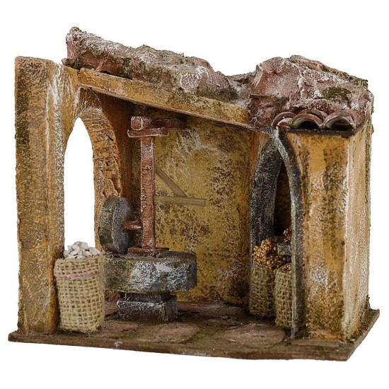 Ambientazione con macina per mugnaio molto realistica e ben rifinita con diversi accessori, la scena può essere personalizzata con ulteriori minuterie disponibili nell'omonima categoria. La struttura risulta ben proporzionata e particolare dato che all'interno presenta un arco a cui si accede ad un magazzino con sacchi di grano. Creato da sapienti mani artigiane italiane in polistirene e legno per statue da 10 cm. Si precisa il prodotto essendo artigianale potrebbe differire leggermente dalla foto.