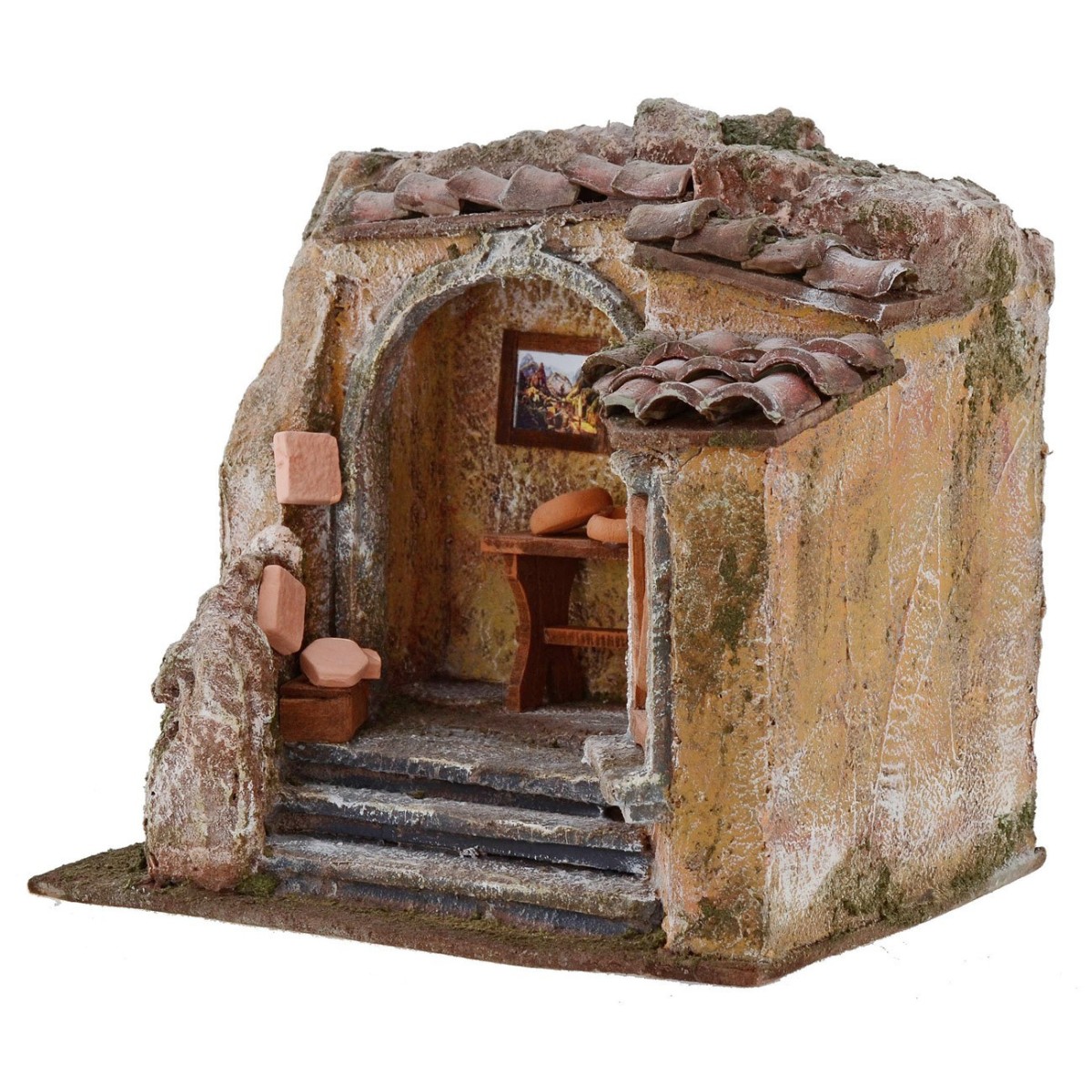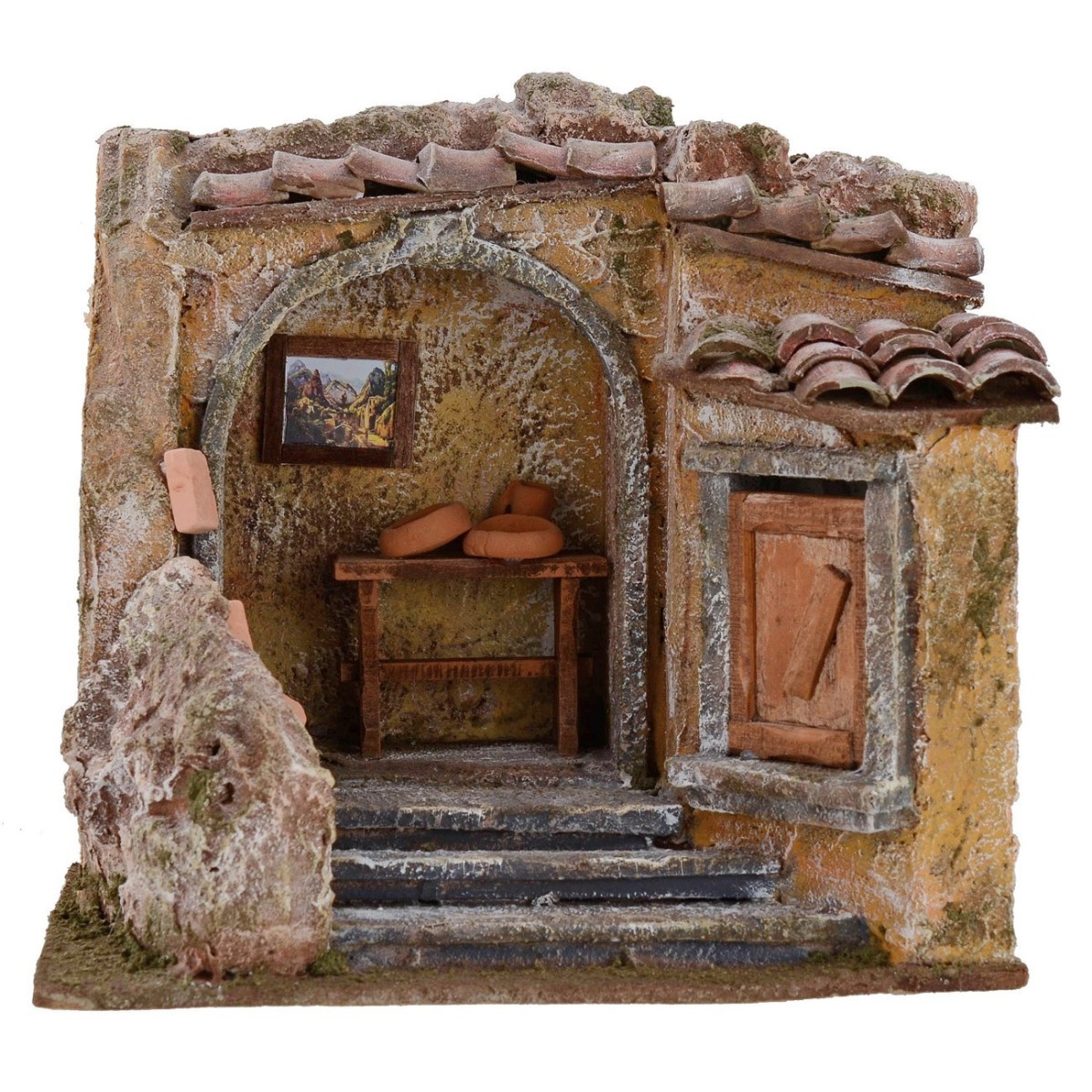 Ambientazione per il Presepe classico popolare di un laboratorio di ceramica: in primo piano si trovano degli scalini che conducono a una bottega di ceramica, dove è presente un tavolino con delle creazioni. Sulla parete è appeso un quadro, mentre verso l'uscita troviamo altre lavorazioni. A destra degli scalini troviamo una finestra in legno chiusa. Il tetto è rifinito di coppi in terracotta. Scena creata da sapienti mani artigiane italiane che può essere personalizzata con anfore e vasi disponibili nell'omonima categoria, prodotta in polistirene, legno e terracotta per statue di 10 cm.