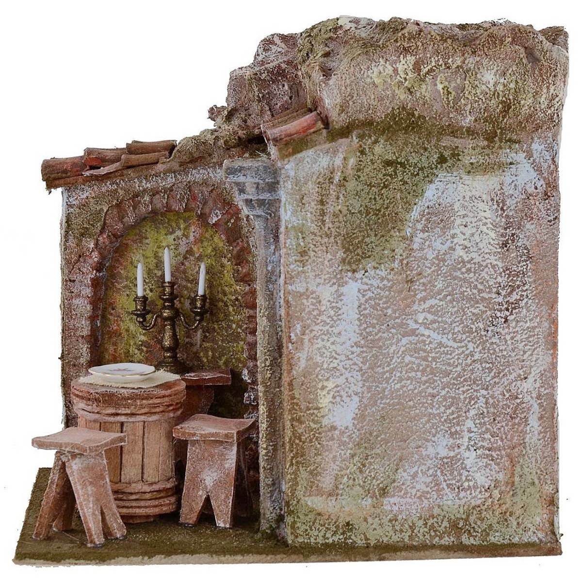 Vineria for the popular classic Nativity scene with an outdoor area where the cylinder of the press is located which serves as a table for diners, a refined porcelain plate decorates the corner. The structure is characterized by a large arch which leads into the room and where a small table with a precious candelabrum is visible. This setting was created by skilled Italian craftsmen for the classic popular crib in polystyrene and wood; the scene is suitable for statues of 10 cm height.