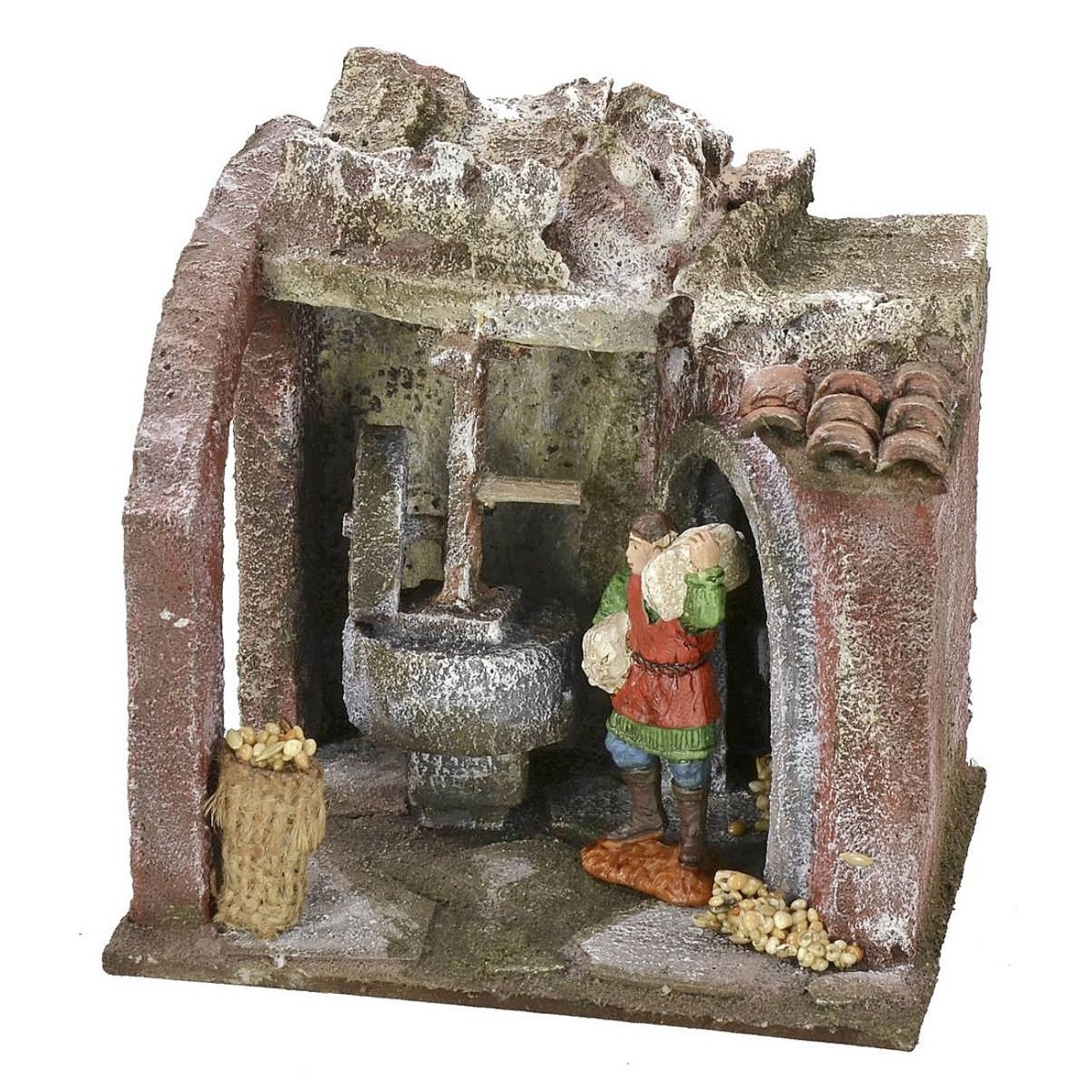 Ambientazione per il Presepe classico popolare di una macina. Prodotto consigliato per statue da 6 h cm, alcune delle quali mostrate nei prodotti correlati. Scena creata da sapienti mani artigiane italiane che può essere personalizzata con minuterie disponibili nell'omonima categoria, prodotta in polistirene, legno, terracotta e plastica per statue di 6 cm.