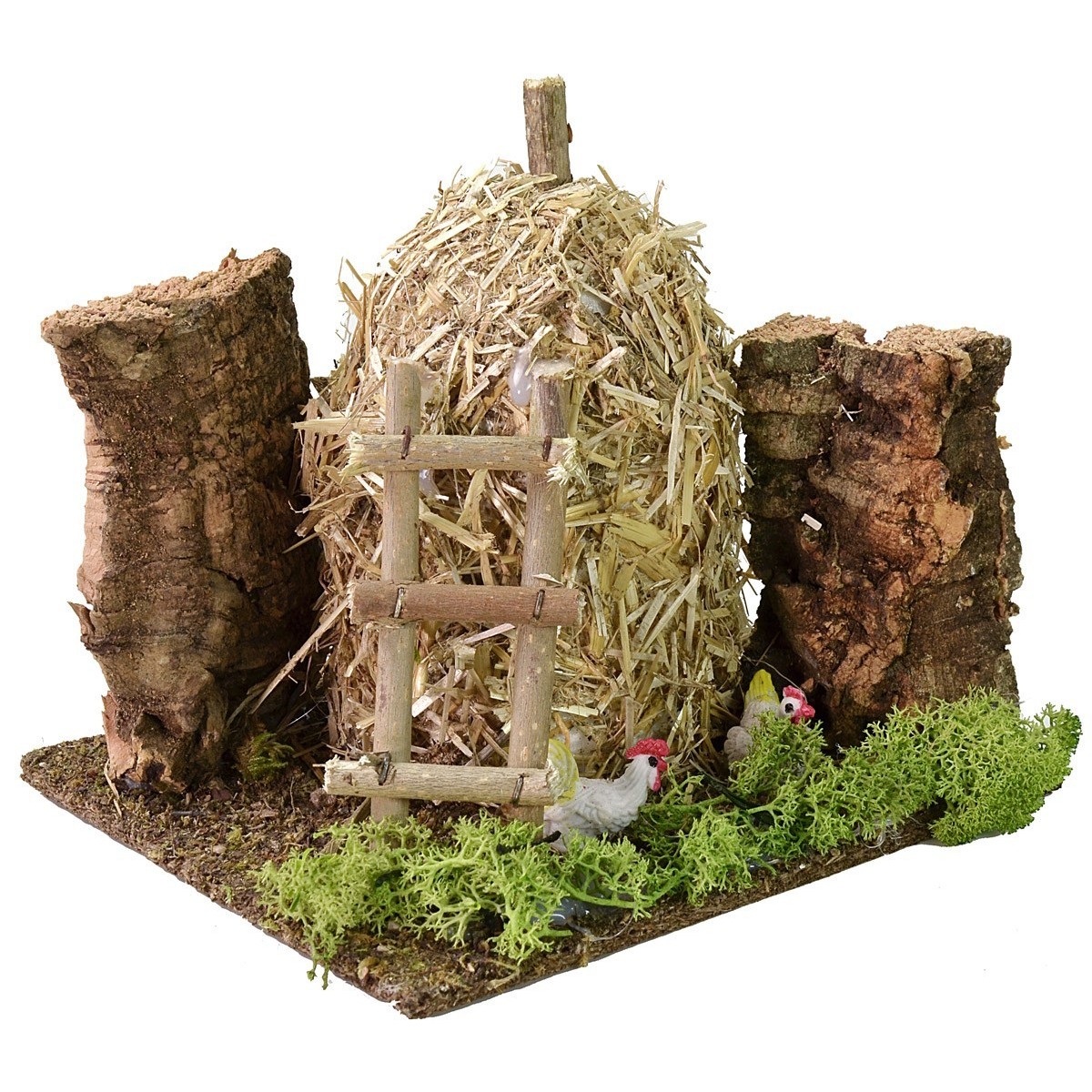 Chicken coop with hens for the nativity scene, the scene is very original and well finished by a large bale of hay to which a wooden ladder rests, next to the cork walls, as well as the two hatching hens. The setting is perfect for enriching the landscape of your nativity scene and is suitable for figurines of 8-10 cm height.