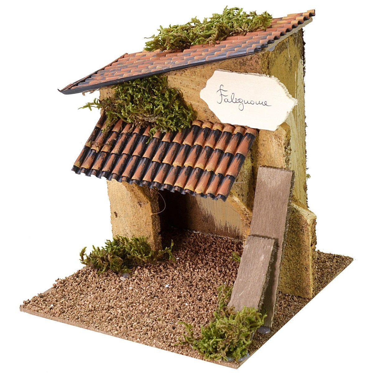 Bottega del falegname segnalata da un cartello in legno con tetto spiovente arricchito da tegole. Sono consigliate statuine dall'altezza cm 8-10 presenti nella categoria del sito 'statue presepe' ed è possibile illuminare l'ambientazione con apposite luci o lanterne presenti nella categoria 'illuminazione presepe' del sito. L'articolo è stato prodotto in legno sughero e muschio.