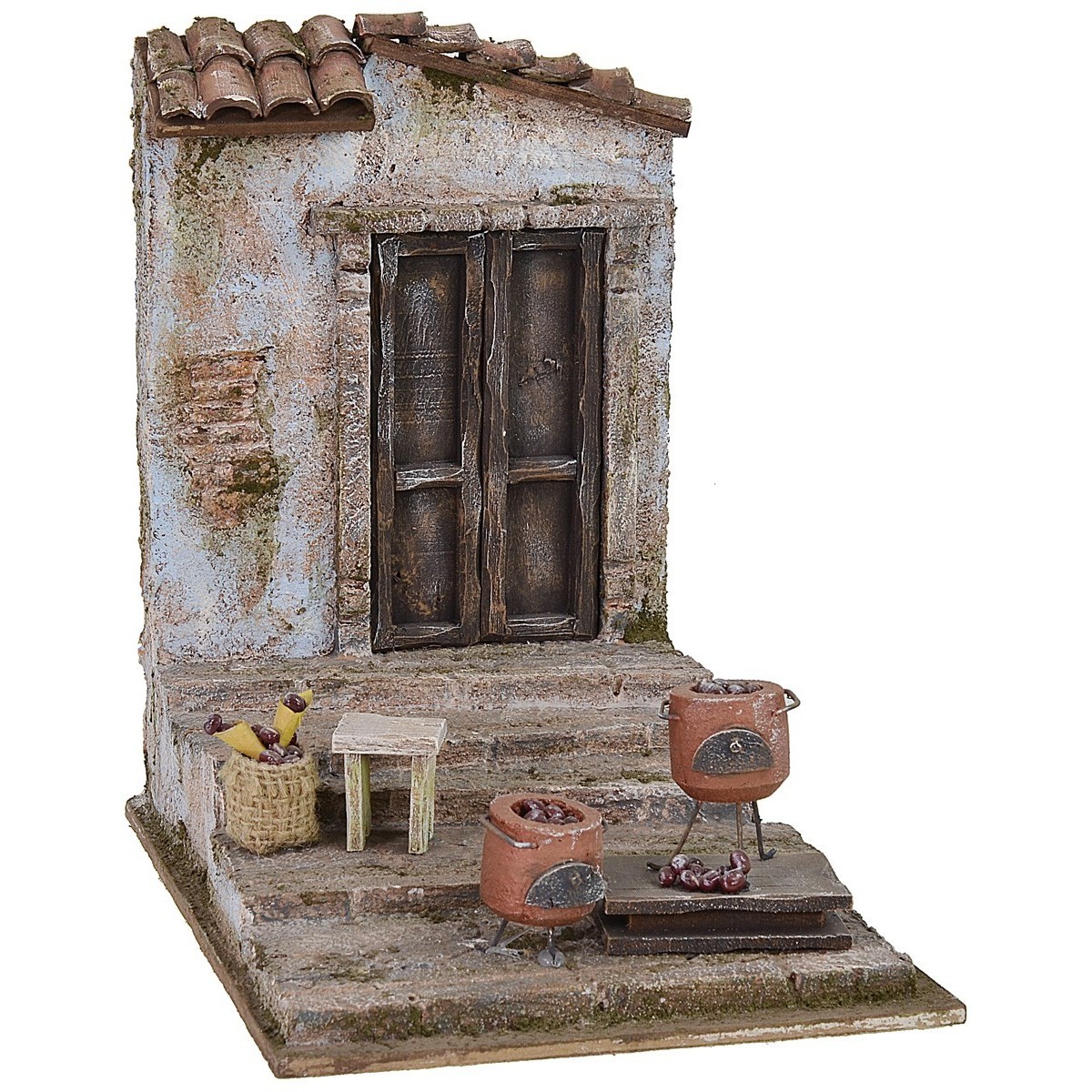 Setting for a chestnut-maker which is accessed thanks to an important staircase where two braziers are placed where the chestnuts are cooked and next to it a stool with a full jute sack. The article is suitable for statues of 12 cm height and was created by skilled Italian craftsmen in polystyrene and wood.