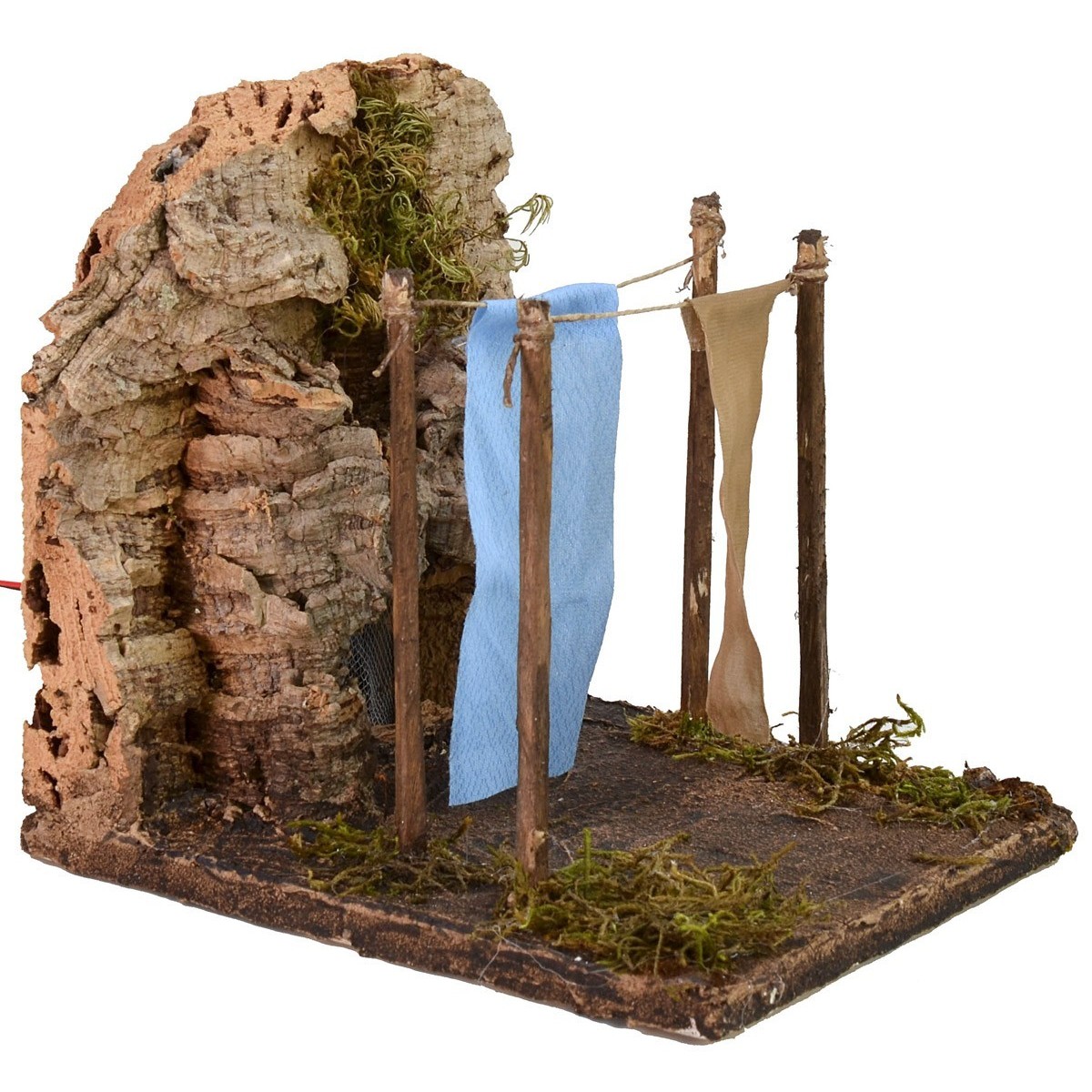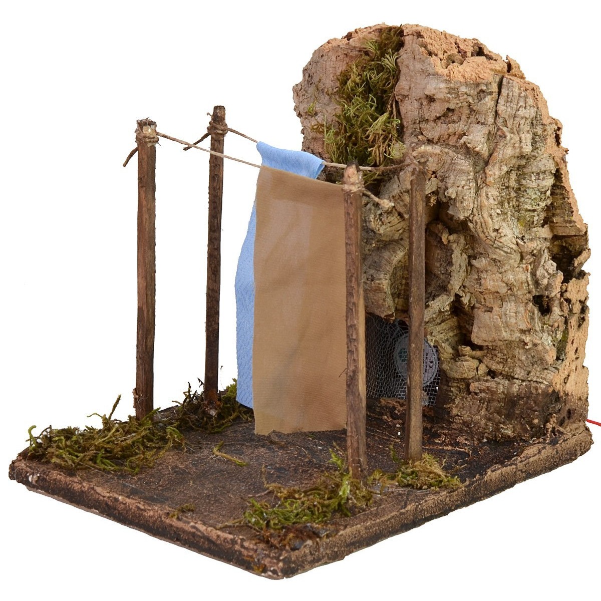 Stendibiancheria con panni che sventolano mossi dal vento creato grazie ad una ventola funzionante a corrente. L'ambientazione è stata prodotta da artigiani italiani con legno sughero e muschio ed è consigliata per statue di altezza 10 cm.